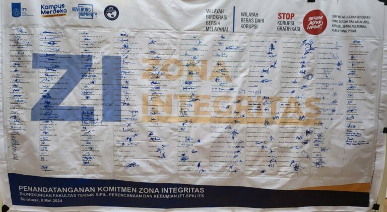 Untuk menunjang pembangunan implementasi zona integritas di Fakultas dan Sekolah di lingkungan Institut Teknologi Sepuluh Nopember di tetapkan Surat Keputusan Rektor Institut Teknologi Sepuluh Nopember Nomor 192/IT2/T/HK.00.01/VIII/2024 tentang Tim Pembangunan Implementasi Zona Integritas Fakultas dan Sekolah Institut Teknologi Sepuluh Nopember. Adapun kelengkapan dokumen Pembangunan Zona Integritas Fakultas Teknik Sipil, Perencanaan dan Kebumian, antara lain sebagai berikut.