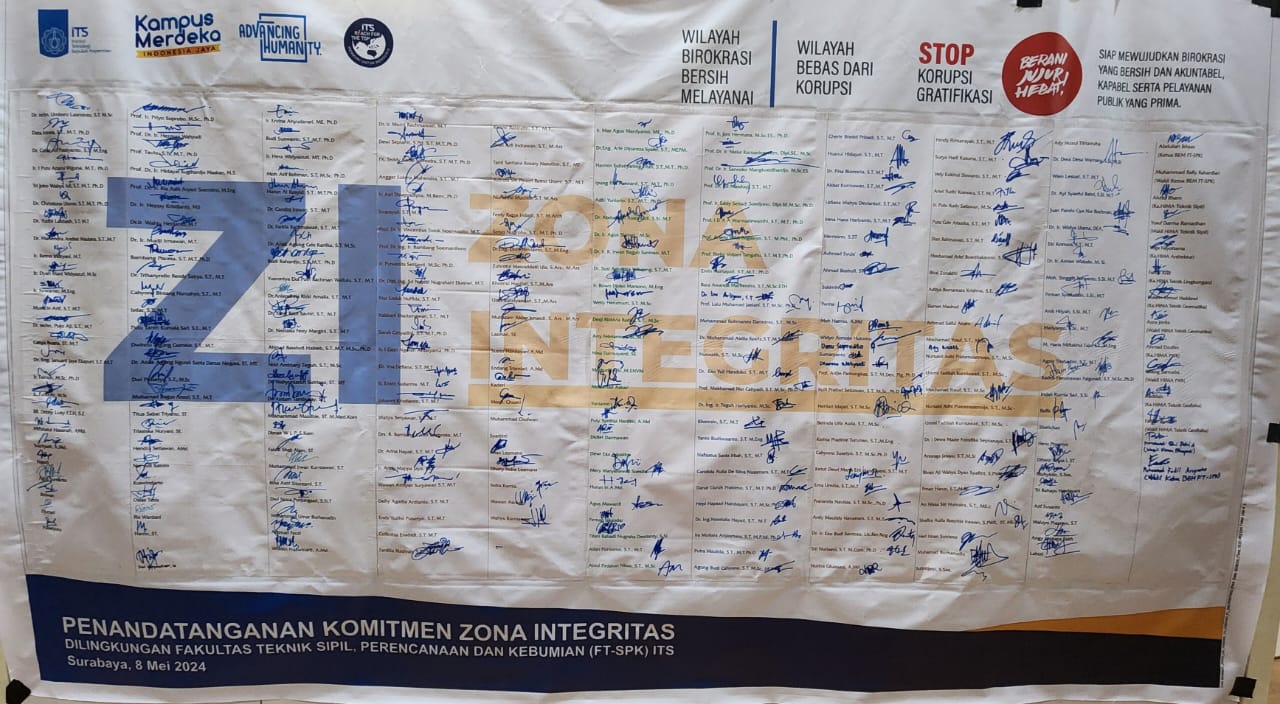 Dekan Fakultas Teknik Sipil, Perencanaan dan Kebumian telah membentuk tim pembangunan Zona Integritas melalui tahapan-tahapan, yaitu diawali Wakil Rektor Bidang Sumber Daya Manusia, Organisasi, dan Teknologi Sistem Informasi ITS dengan melakukan rapat sosialisasi Zona Integritas ditingkat Institut dan Fakultas dengan mengundang Para Dekan, Para Wakil Dekan dan para Kepala Bagian dilingkungan Fakultas pada tanggal 17 November 2023. Kemudian dilanjutkan sosialisasi ditingkat Fakultas pada tanggal 27 Desember 2023 sekaligus mengumumkan rekrutmen tim pembangunan Zona Integritas. Pada tanggal 03 Januari 2024 Dekan melalui surat edaran mengumumkan hasil seleksi daftar nama tim kerja Pembangunan Zona Integritas Fakultas Teknik Sipil, Perencanaan dan Kebumian dengan Nomor 403/IT2.IX.3/T/HK.00.02/I/2024. Kemudian hasil seleksi disampaikan ke Dekan untuk diterbitkan Surat Keputusan Dekan. Pada tanggal 04 Januari 2024 terbitlah Surat Keputusan Dekan Fakultas Teknik Sipil, Perencanaan, dan Kebumian Nomor 616/IT2.IX.3/T/HK.00.02/I/2024 tentang Penetapan Tim Implementasi Pembangunan Zona Integritas Fakultas Teknik Sipil, Perencanaan, dan Kebumian.