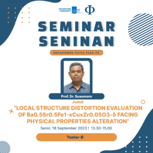 Topik yang akan diangkat dalam kesempatan kali ini adalah “LOCAL STRUCTURE DISTORTION EVALUATION OF Ba0.5Sr0.5Fe1-xCuxZr0.05O3-δ FACING PHYSICAL PROPERTIES ALTERATION”.