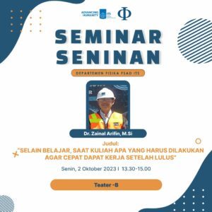 Departemen Fisika, Fakultas Sains dan Analitika Data (FSAD), Institut Teknologi Sepuluh Nopember (ITS) akan menyelenggarakan kembali kegiatan Seminar Seninan pada minggu ke-6 perkuliahan Semester Gasal 2023/2024 ini, tepatnya pada tanggal 2 Oktober 2023.
