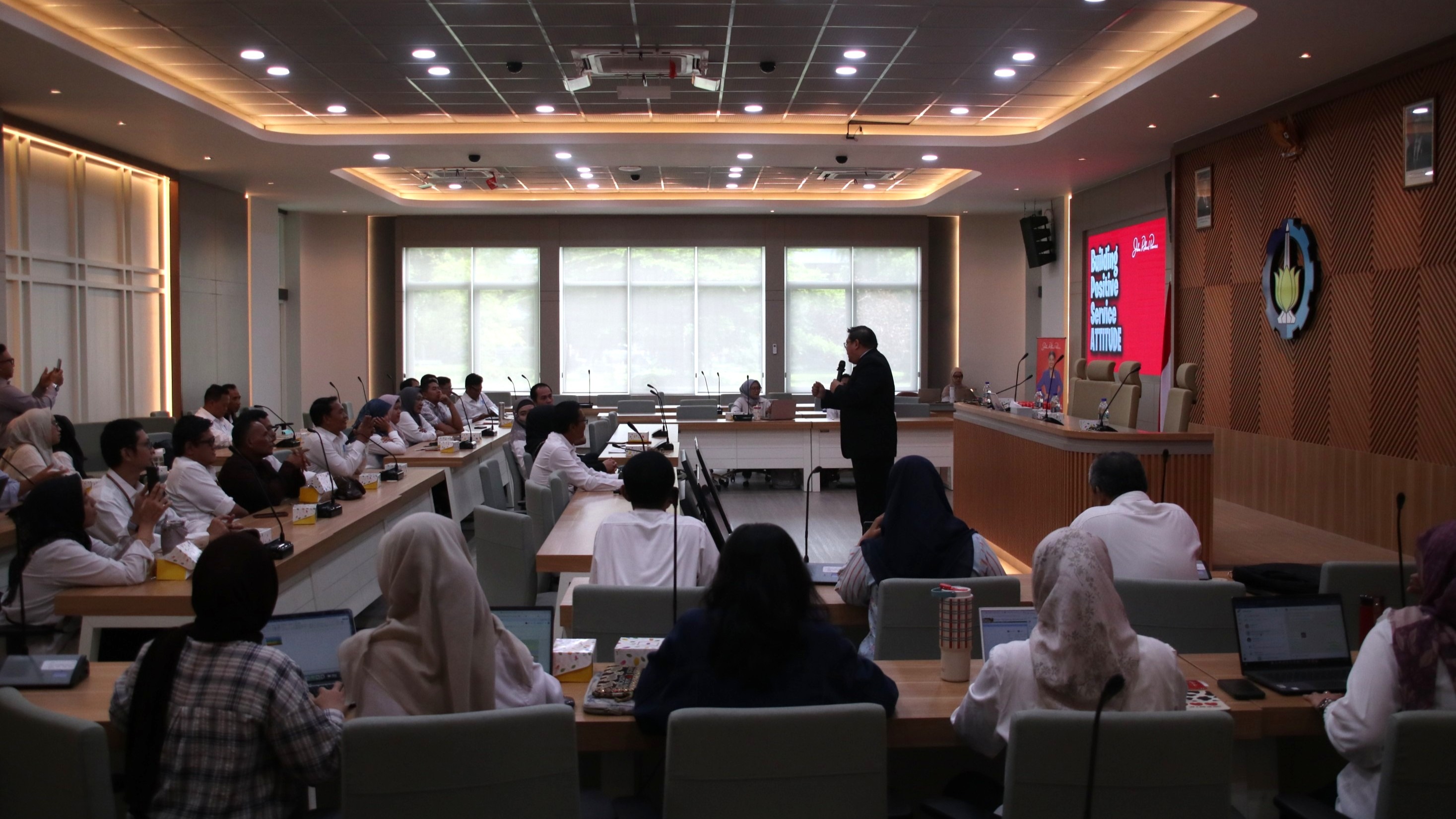 Surabaya, FT-EIC ITS – Fakultas Teknologi Elektro dan Informatika Cerdas (FT-EIC) Institut Teknologi Sepuluh Nopember (ITS) menyelenggarakan pelatihan bertajuk “Building Positive Service Attitude dan Interpersonal Skills” bekerja sama dengan John Roberts Powers International, Senin (15/12/2025). Kegiatan ini berlangsung di Ruang Sidang Senat Lantai 1, Gedung Rektorat ITS, Sukolilo, dan diikuti oleh kurang lebih 100 peserta yang terdiri dari dosen serta tenaga kependidikan.