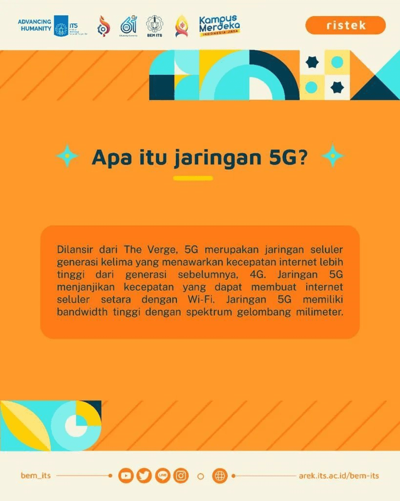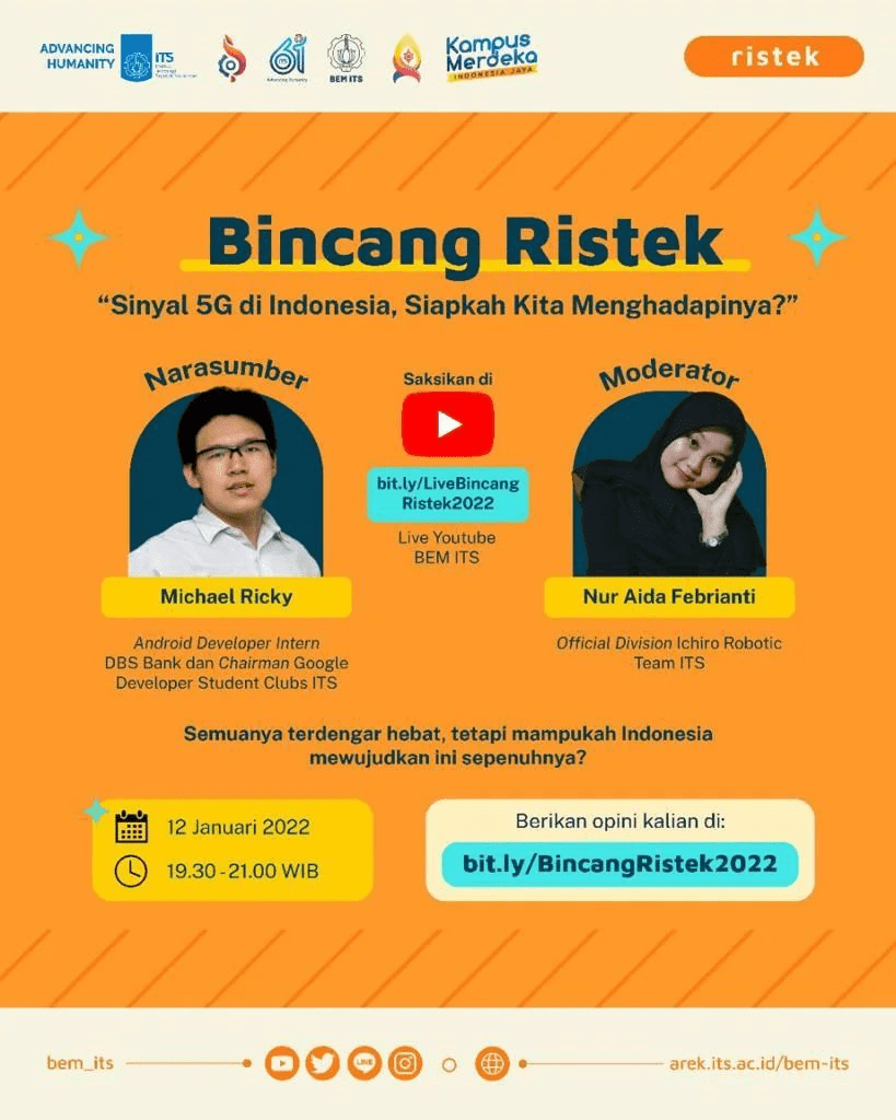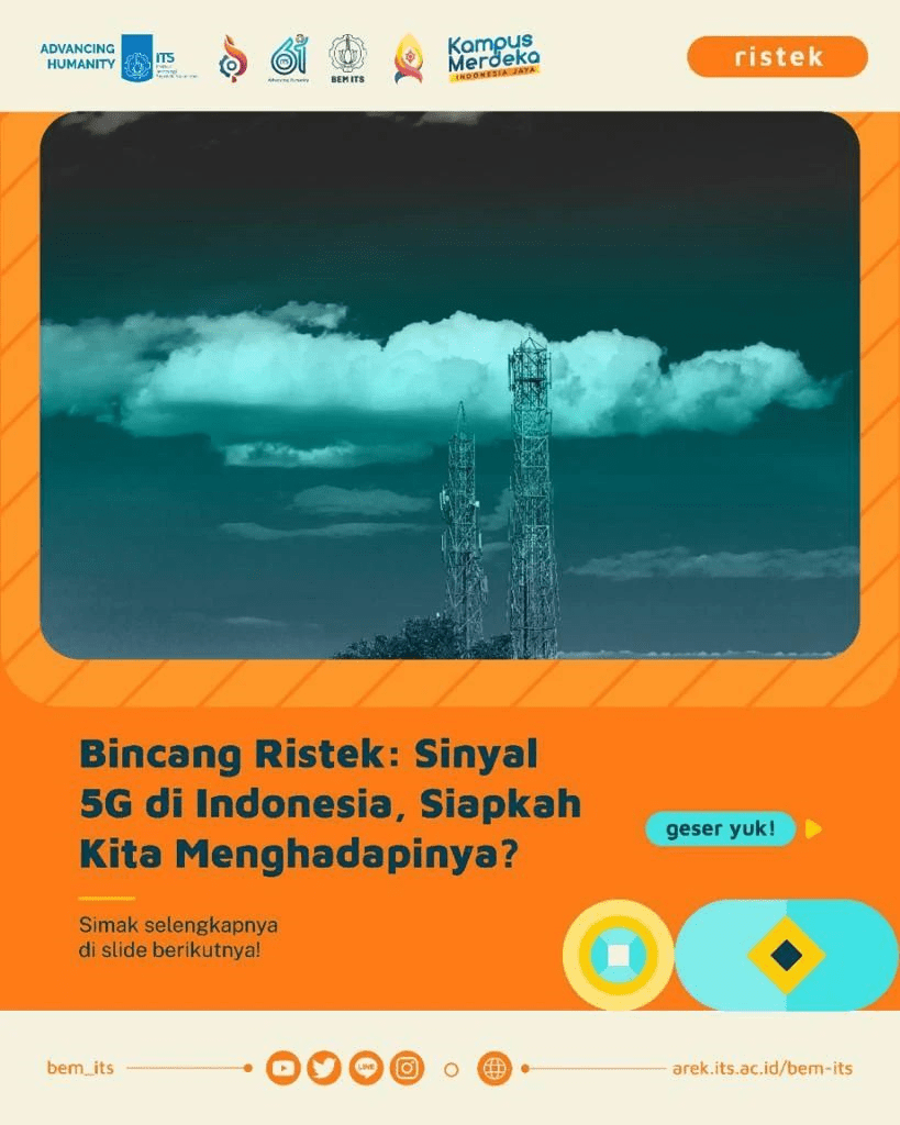 Kementerian Riset dan Teknologi BEM ITS menghadirkan Bincang Ristek dengan tema โSinyal 5G di Indonesia, Siapkah Kita Menghadapinya?โ yang menghadirkan narasumber dari mahasiswa ITS dan juga mengundang seluruh KM ITS untuk turut berpartisipasi dalam diskusi tersebut.