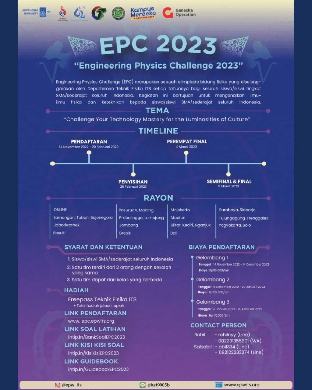 📝EPC 2023📝 EPC merupakan Olimpiade bidang Fisika Matematika yang diselenggarakan oleh Departemen Teknik Fisika ITS setiap tahunnya bagi seluruh siswa/siswi SMA/SMK/sederajat seluruh Indonesia.