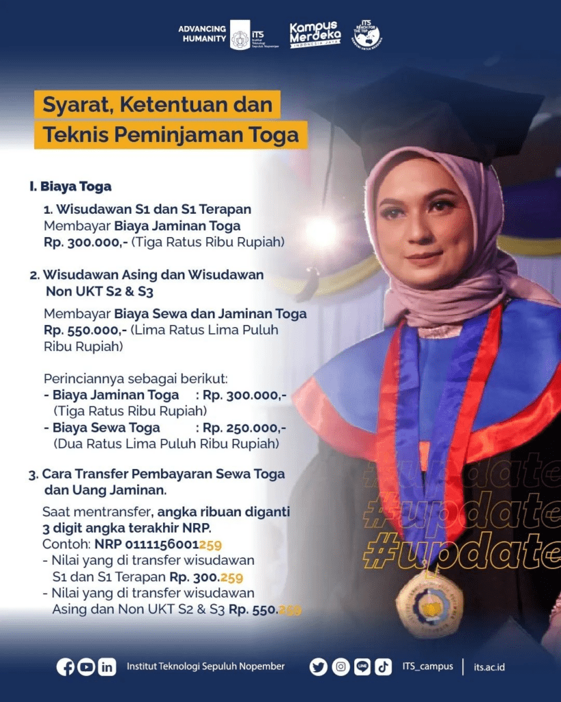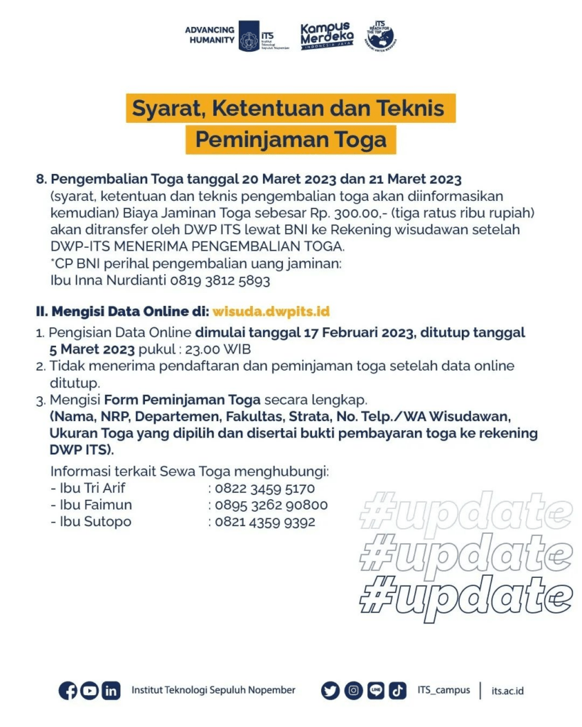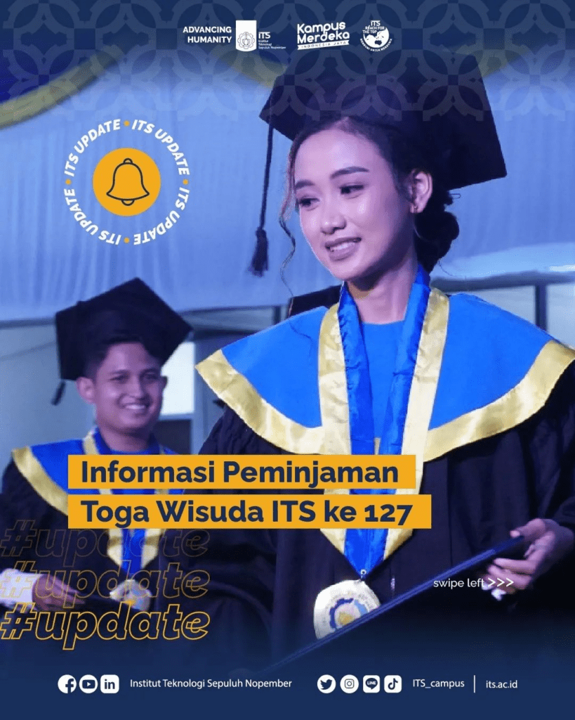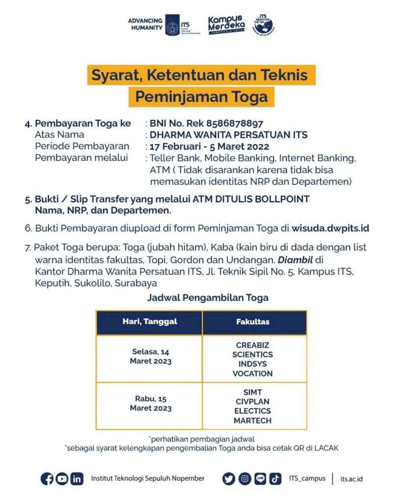 Berikut ini adalah informasi mengenai peminjaman toga kepada wisudawan Wisuda ITS ke-127 yang akan diselenggarakan tanggal 18 dan 19 Maret 2023. Mohon dibaca dan dicermati, dan pastikan tidak ada informasi yang terlewat.