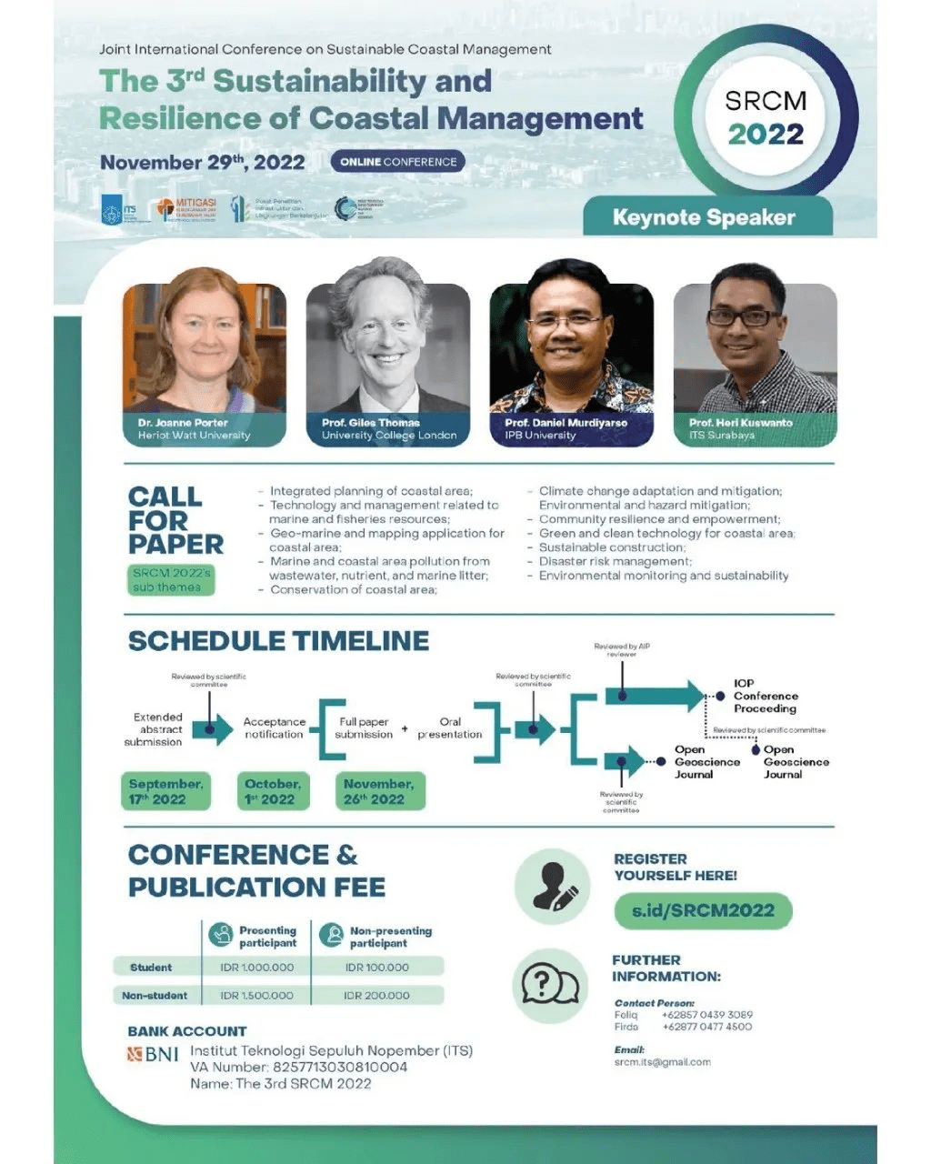 The conference will be held online with four well-known keynote speakers, namely: – Dr. Joanne Porter (Heriott Wat University) – Prof. Giles Thomas (University College London) – Prof. Daniel Murdiyarso (IPB University) – Prof. Heri Kuswanto (ITS Surabaya)