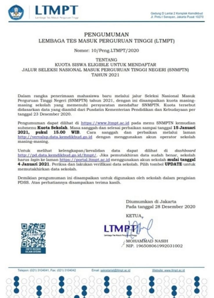 Pengumuman LTMPT Terkait Kuota Siswa Eligible Mendaftar SNMPTN 2021