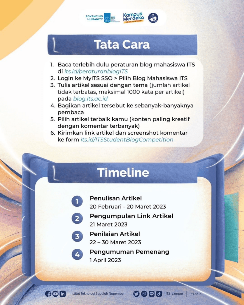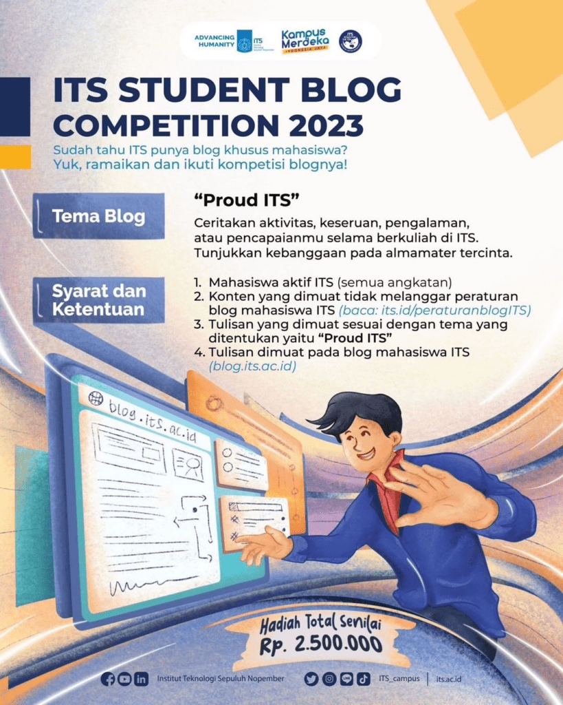 Halo sobat kampus! Sudah tau belum nih, ITS sekarang punya blog khusus mahasiswa? ITS Student Blog Competition 2023 dibuka untuk seluruh mahasiswa aktif ITS dengan tema