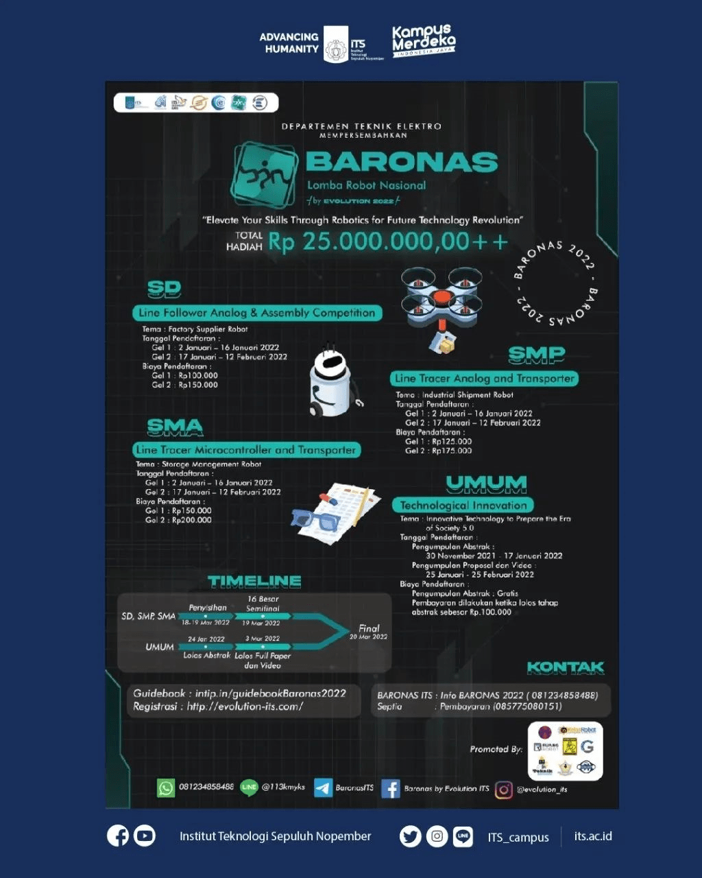 Ayo daftarkan inovasi terbaik kalian dan jadilah pemenang BARONAS 2022! Terus pantau lini masa kami agar kalian tidak ketinggalan berita terbaru dari kami! Line : @czc7495e Instagram : evolution_its Twitter : @evolution_its Web : evolution-its.com