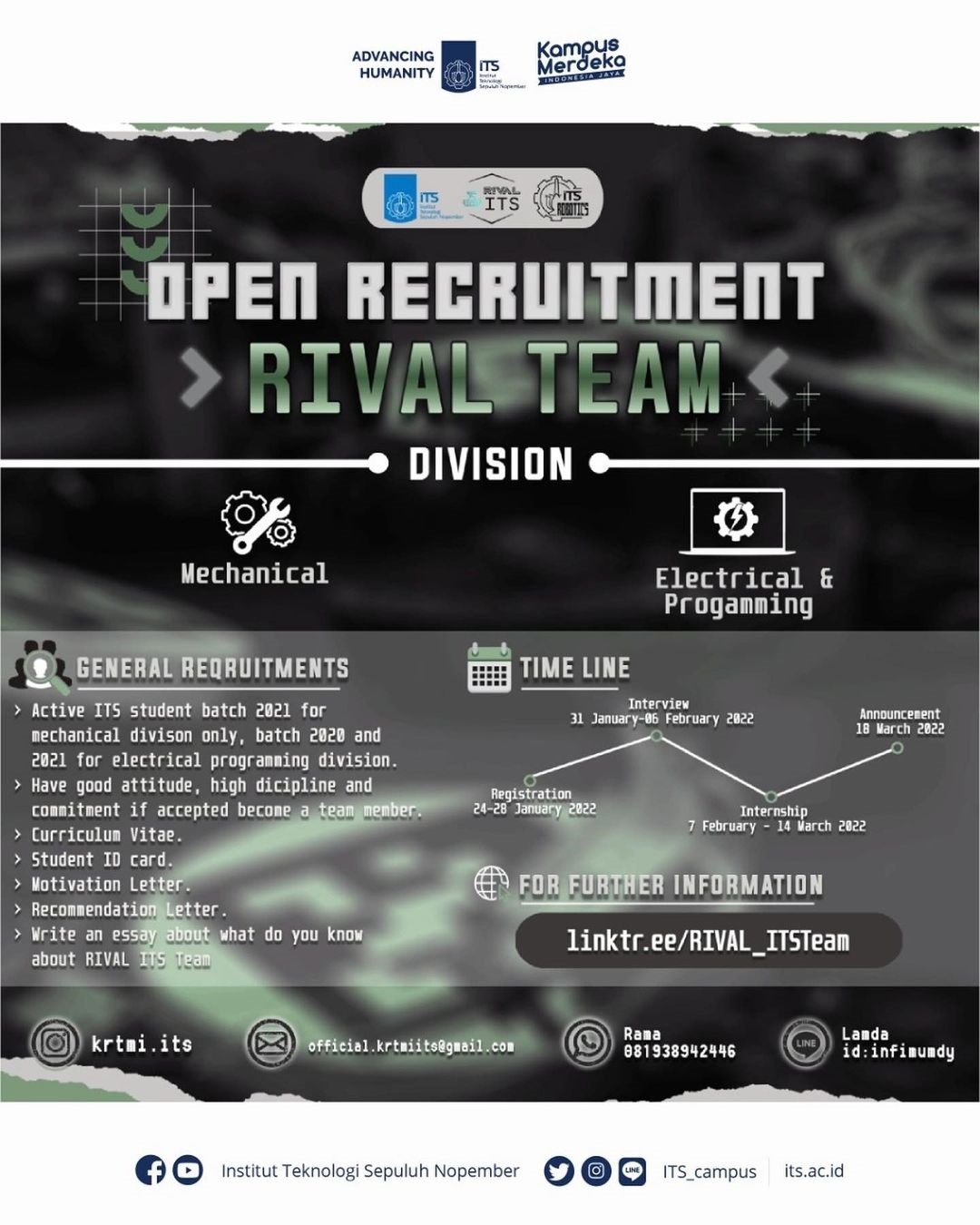 The wait is over, currently RIVAL ITS TEAMS open for recruitment open to division : – Mechanic – Electro Programming