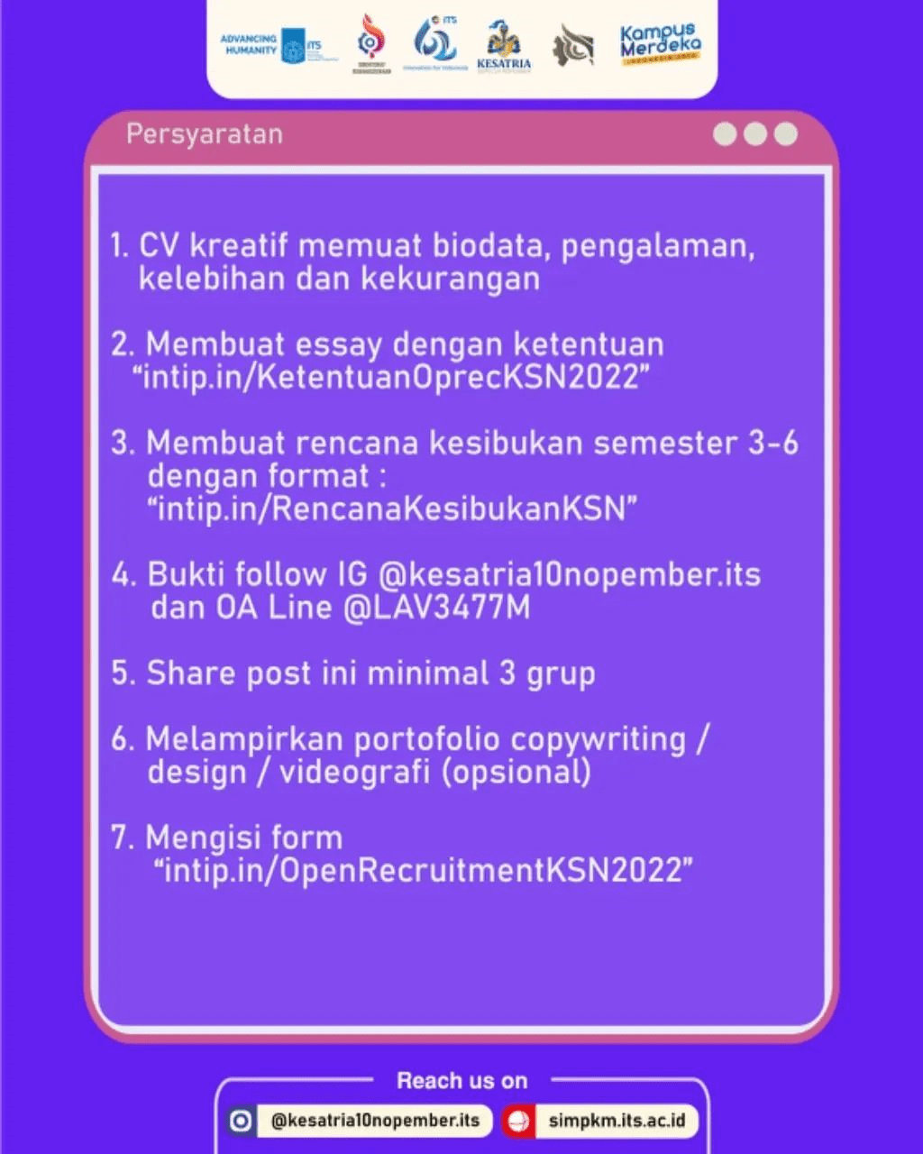 So, jangan sia-siakan kesempatan emas untuk bergabung dengan KSN. Buruan daftar di link berikut: https://intip.in/OpenRecruitmentKSN2022