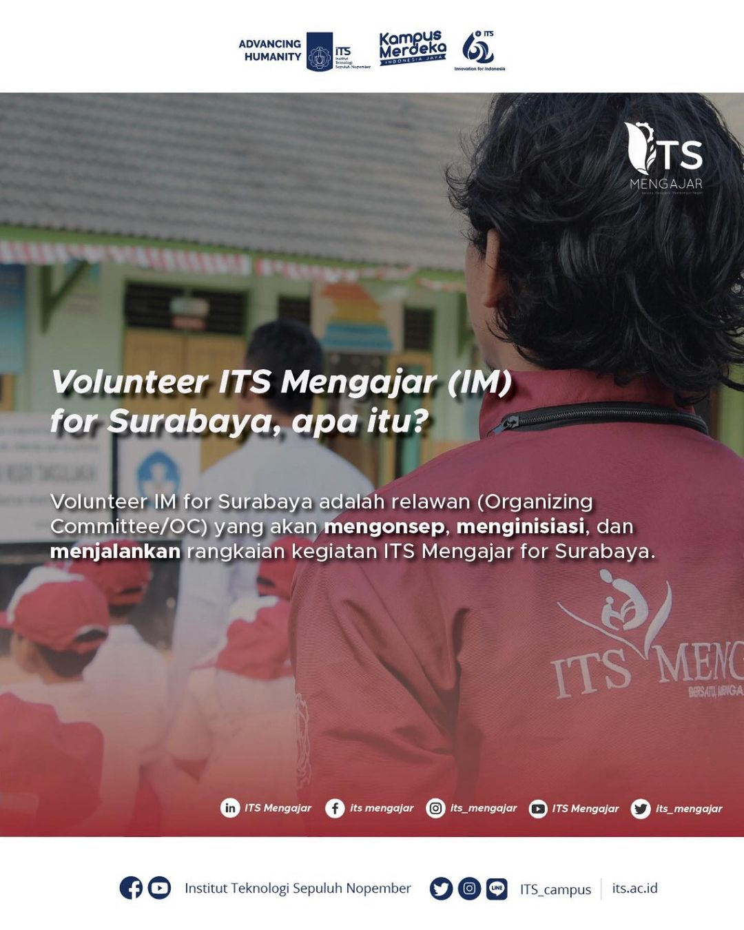 Halo, Sobat Pendidikan! Galim meminta bantuan kamu nih untuk menjadi bagian dalam menjalankan ITS Mengajar for Surabaya. Volunteer IM for Surabaya adalah relawan yang akan mengonsep, menginisiasi, dan menjalankan rangkaian kegiatan ITS Mengajar for Surabaya.