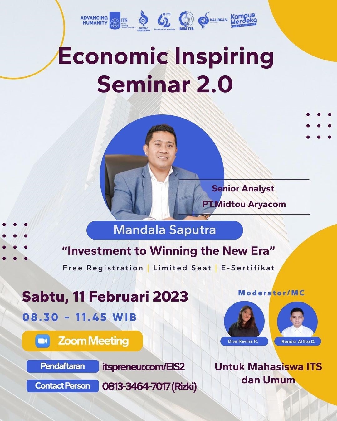Economic Inspiring Seminar kini hadir kembali dengan tema “Investment to Winning the New Era”. Acara ini merupakan wadah pengembangan bagi generasi muda untuk menambah pengalaman dan softskill khususnya di bidang investasi. 25 Jadi, tunggu apa lagi? segera daftarkan dirimu pada link di bawah ini! itspreneur.com/EIS2