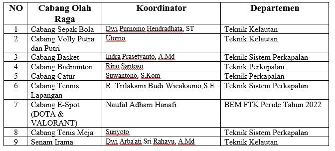 Untuk ITS Sportaiment sendiri di selenggarakan pada tanggal 1 Agustus sampai dengan 01 Oktober 2022, sedangkan Fakultas Teknologi Kelautan mengikuti 9 Cabang Olah Raga di antaranya :