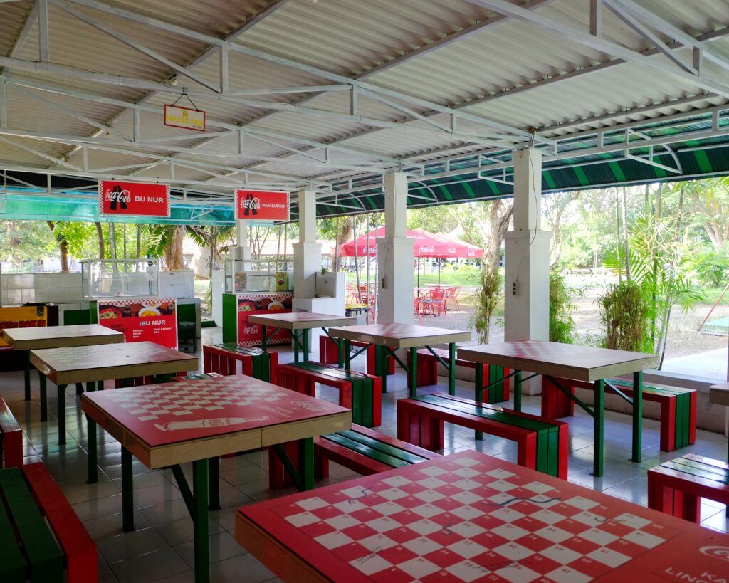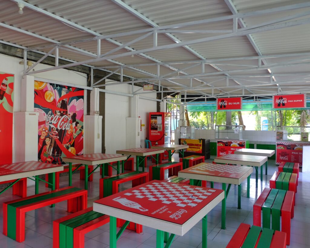 Kantin Teknik Lingkungan ITS menghadirkan suasana terbuka yang segar dengan dominasi warna merah dan hijau khas Coca-Cola yang menarik perhatian. Kantin ini dilengkapi meja-meja kayu panjang dengan bangku tanpa sandaran, serta dekorasi dinding dan papan nama tenant yang seragam dan cerah. Di area dalamnya, terdapat beberapa gerai makanan seperti milik Bu Nur dan Pak Supar yang menawarkan beragam pilihan menu seperti rawon, nasi campur, hingga mi instan, lengkap dengan lemari pendingin minuman yang tertata rapi.