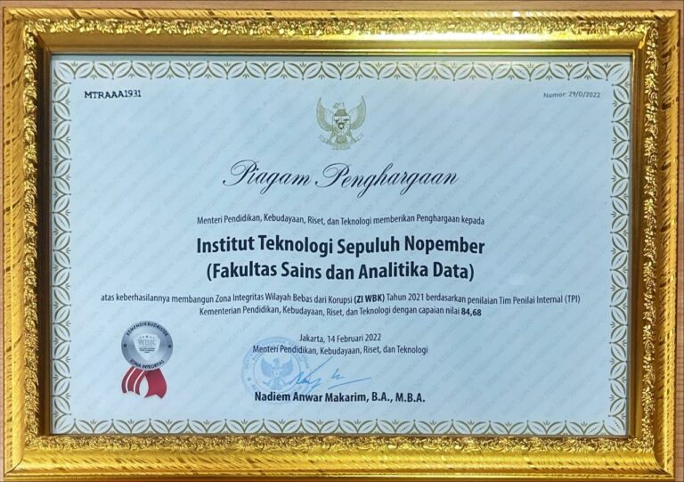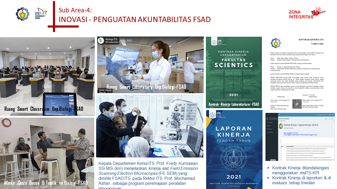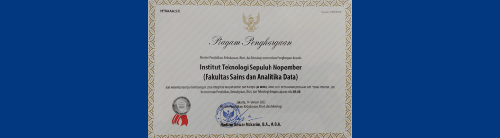 Dalam rangka mewujudkan pemerintahan yang bersih, efektif, dan melayani, Fakultas Sains dan Analitika Data ITS secara aktif membangun Zona Integritas (ZI) menuju predikat Wilayah Bebas dari Korupsi (WBK) dan Wilayah Birokrasi Bersih dan Melayani (WBBM). Salah satu area perubahan penting dalam pembangunan ZI adalah Penguatan Akuntabilitas Kinerja.