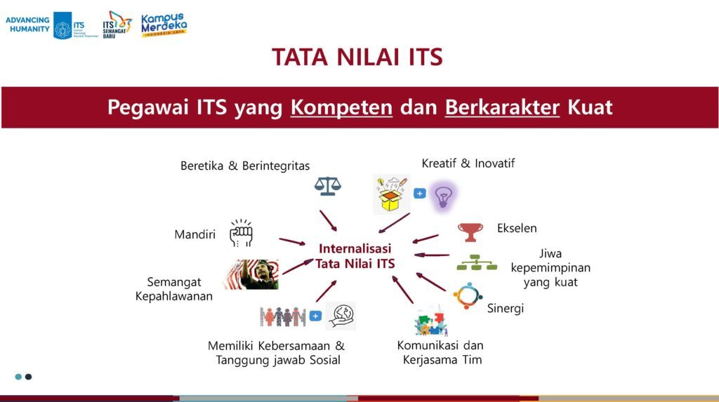 # Pegawai ITS yang Kompeten dan Berkarakter Kuat Budaya kerja dan pola pikir telah dibangun melalui penetapan pimpinan sbg role model, penetapan agen perubahan, lomba 5S+S, ITSprovement, internalisasi motto ITS Advancing Humanity dan ITSSemangat Baru melalui kegiatan sehari-hari di FSAD