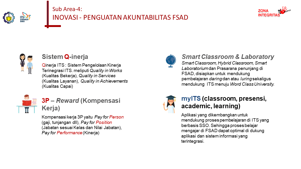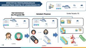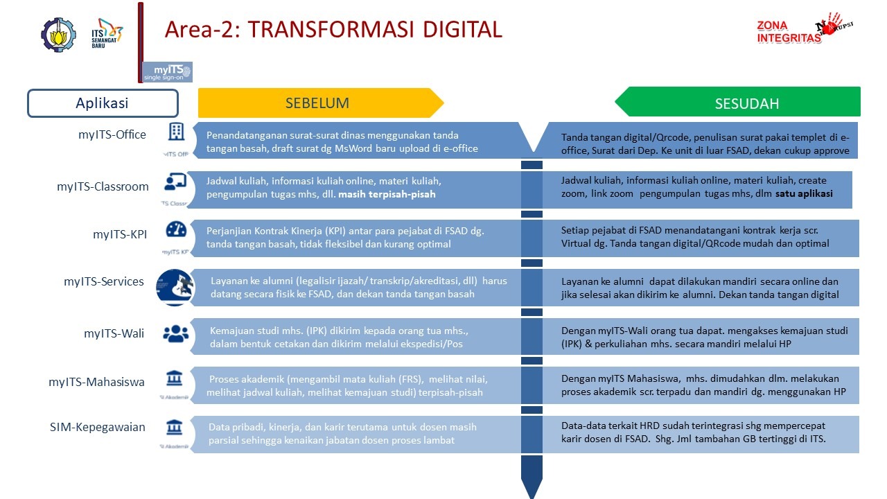 # Meningkatnya penggunaan teknologi informasi. Single Sign On (SSO) ITS, terdapat Aplikasi UTAMA dan Aplikasi SERVICE. Aplikasi UTAMA, meliputi berbagai aplikasi yang melekat kepada job disk dari Tendik / Dosen. tiap bagian memiliki Aplikasi yang berbeda, dan terintegrasi antar unit di lingkungan ITS. SI Akademik, Aplikasi yang mengakomodasi akademik dimana dosen/tendik itu bertugas, mulai dari data mahasiswa, perwalian, status pembayaran ukt, sampai yudisium. SI Kepegawaian, Aplikasi yang mengakomodasi kepegawaian dimana dosen/tendik itu bertugas, mulai dari data pegawai, presensi, jobdisk, kinerja, takehomepay, penilaian individu, dll. MyITSWorkTime, Aplikasi yang mengakomodasi presensi Dosen & Tendik, didalamnya terdapat GPS, survey kesehatan individu, sampai ceklist pekerjaan tendik setiap akhir presensi. MyITSOffice, Aplikasi yang mengakomodasi persuratan elektronik, dimana aplikasi ini memangkas birokrasi dan mempercepat proses persuratan secara papperless, yang juga menggunakan tandatangan elektronik dengan QRCode untuk menjaga keontentikan dari surat tersebut. Aplikasi SERVICE, meliputi berbagai aplikasi yang mendukung pekerjaan tiap bagian, dan tiap bagian memiliki aplikasi service yang sama. # Transformasi Digital yang terjadi di linkungan FSAD ITS. Dari banyaknya aplikasi yang disebutkan diatas, berikut Transformasi ” Before – After ” tiap aplikasi. # Meningkatnya efisiensi dan efektivitas proses manajemen pemerintahan. Transformasi yang terjadi di Lingkungan FSAD tentunya membawa perubahan dalam proses administrasinya, sehingga membawa dampak efisiensi, efektif dan akuntable.