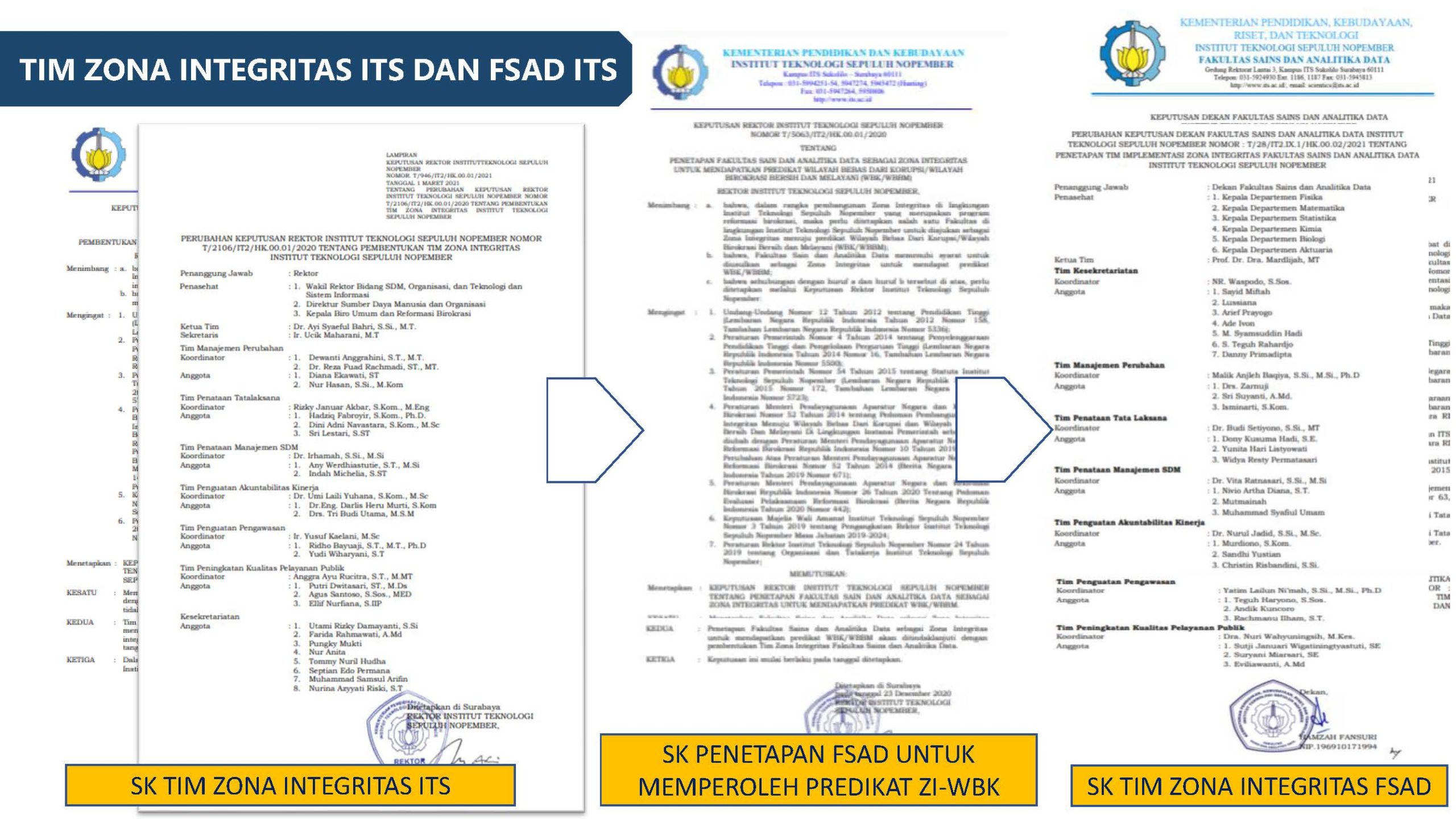 Sebagai bagian dari komitmen untuk mewujudkan lingkungan birokrasi yang bersih dan melayani, Fakultas Sains dan Analitika Data (FSAD) Institut Teknologi Sepuluh Nopember (ITS) secara aktif membangun Zona Integritas (ZI) menuju Wilayah Bebas dari Korupsi (WBK). Salah satu area perubahan penting dalam pembangunan ZI adalah Penataan Tata Laksana.