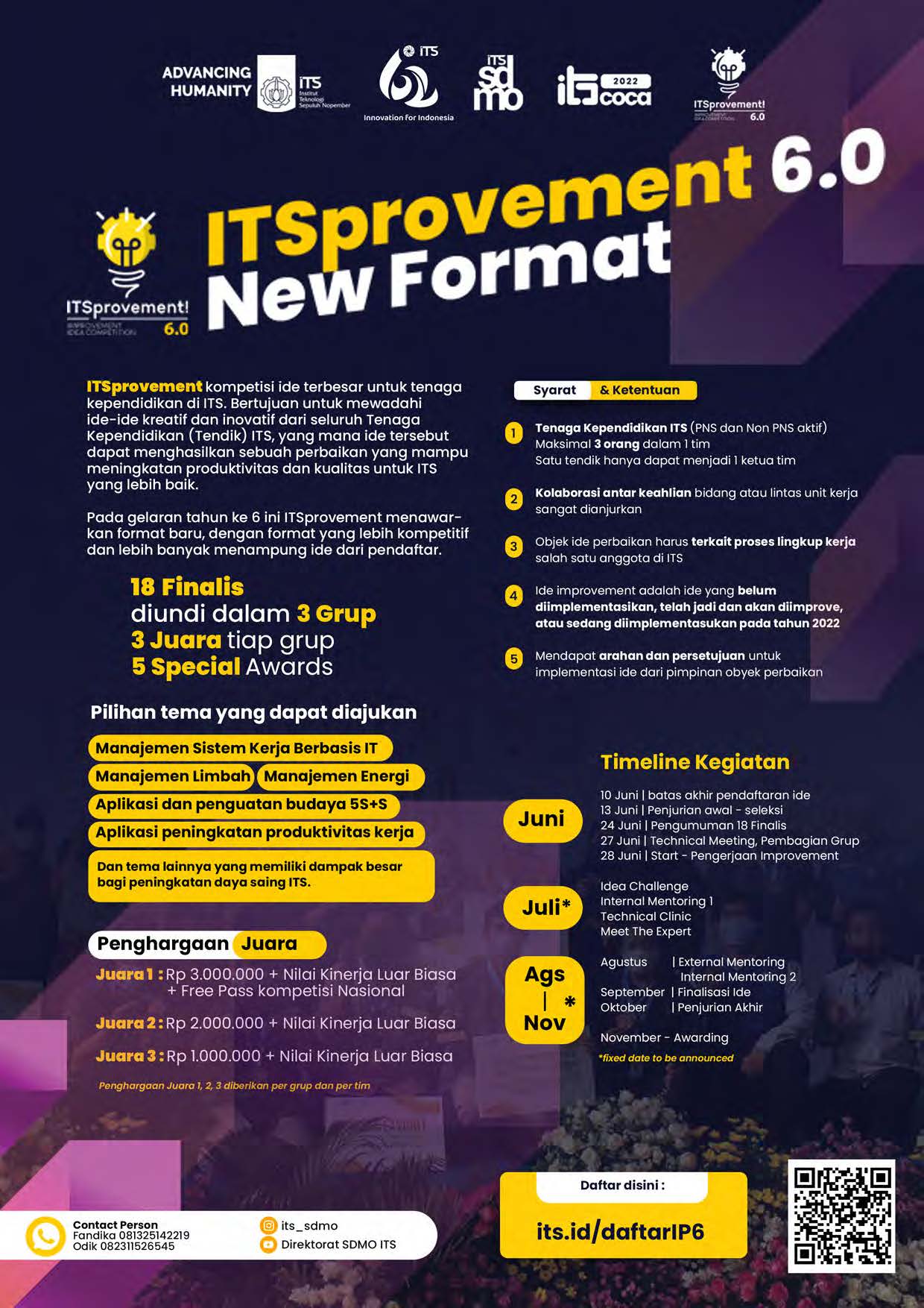 Perubahan status organisasi menjadi Perguruan Tinggi Negeri Berbadan Hukum (PTN-BH) merupakan momentum penting bagi ITS untuk berbenah dan bertransformasi menjadi lebih produktif, inovatif, dan berdaya saing yang tinggi. Upaya berkelanjutan perlu digencarkan oleh semua pihak internal kampus. Setiap stakeholder ITS memiliki tanggung jawab yang sama untuk menciptakan iklim pembaharuan, budaya untuk selalu melakukan perbaikan sistem dan proses kerja. Sebagai wujud nyata proses perubahan, ITS menginisiasi adanya program ITSprovement yang merupakan wadah bagi para inovator ITS untuk berkompetisi mengajukan ide inovasi yang dapat menimbulkan efektivitas dan efisiensi kerja di lingkungan kampus ITS.