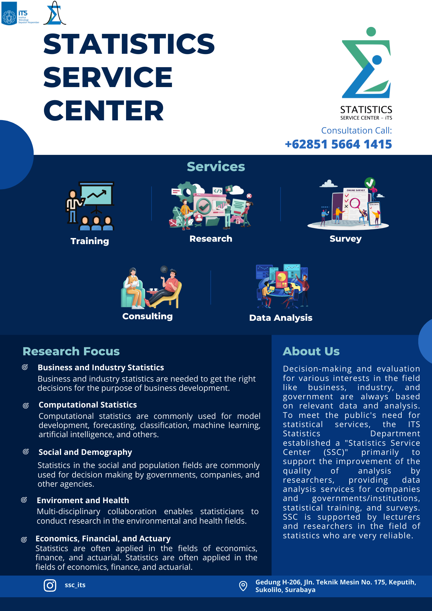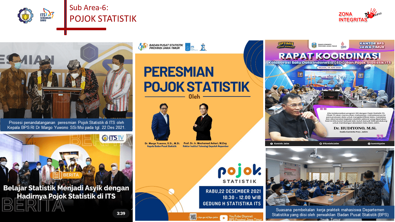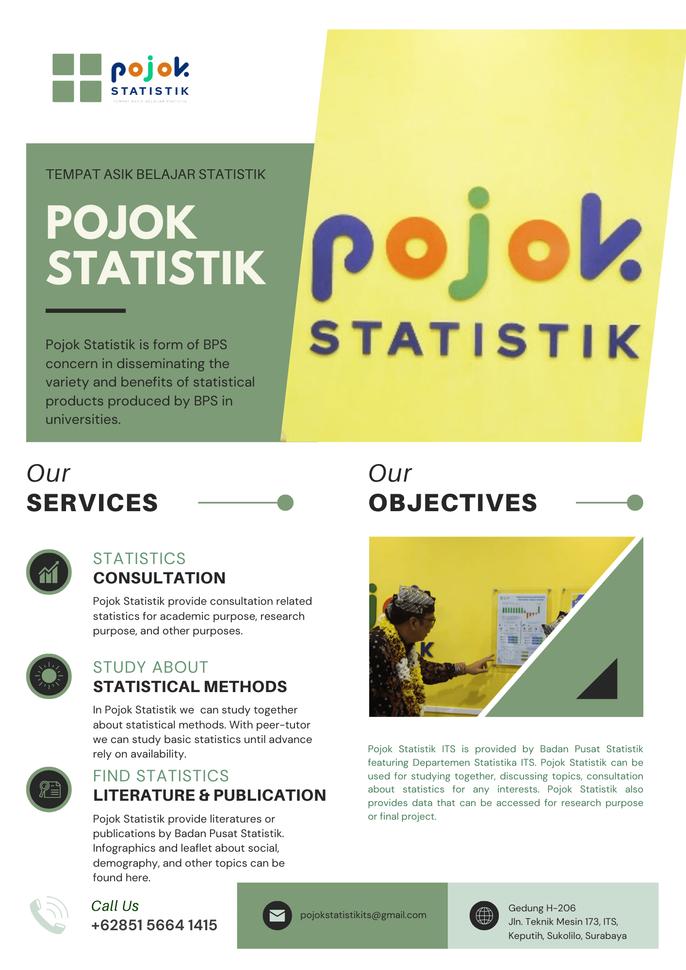 # Pojok Statistik dan Statistic Service Center, untuk mendukung penyebarluasan ragam dan manfaat produk statistik bagi civitas dan masyarakat dengan tagline ‘Tempat Asyik Belajar Statistik’, serta membantu mahasiswa dalam meimplementasikan ilmu statistika.