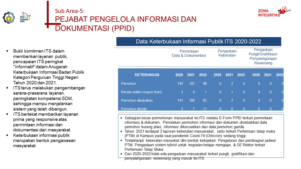 dimana sejak tahun 2020 – 2021 ITS meraih Anugrah Keterbukaan Informasi Publik Kategori Perguruan Tinggi Negeri sebagai Badan Publik Informatif.