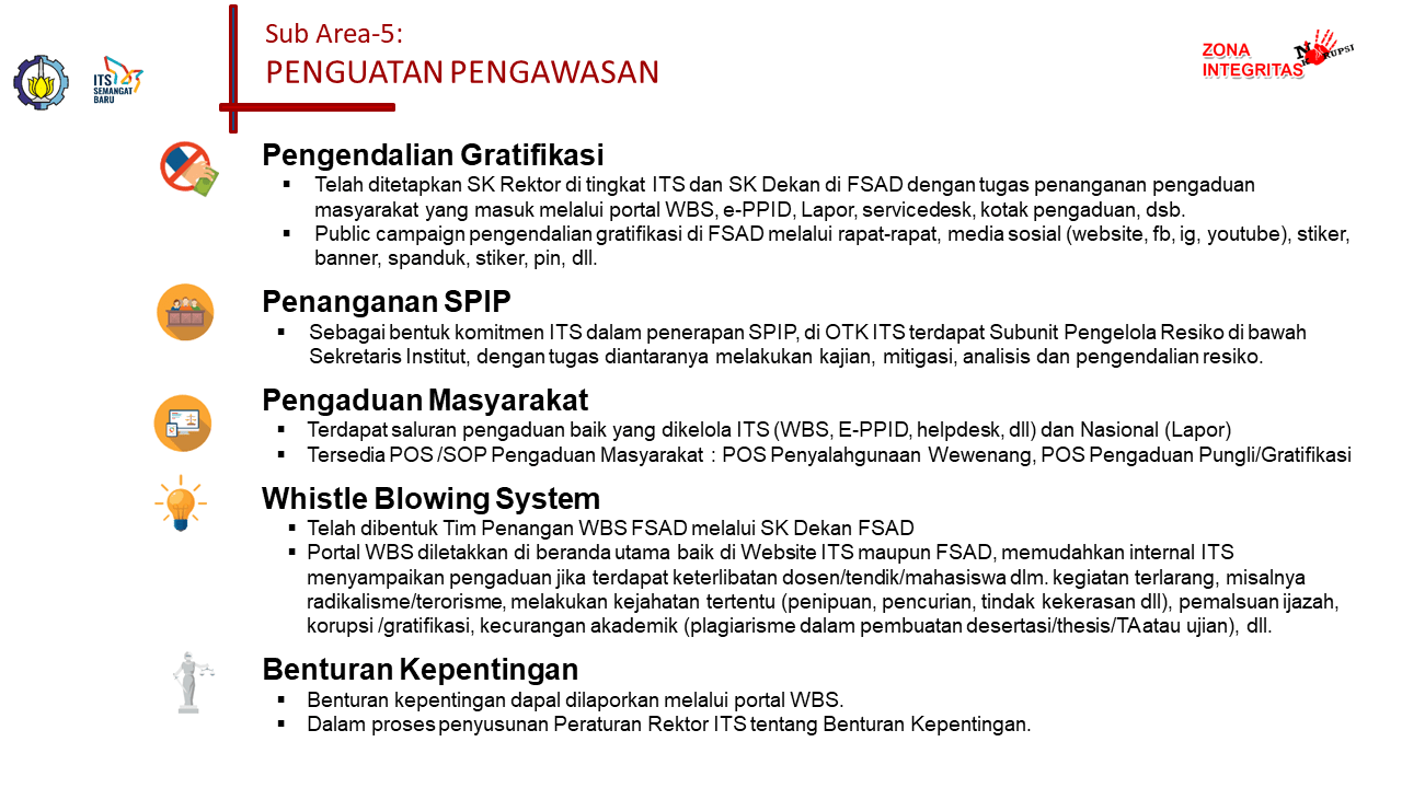 # Gratifikasi. # Penerapan SPIP. # Pengaduan Masyarakat. # Whistle Blowing System. # Penanganan Benturan Kepentingan. # Bukti komitmen ITS dalam memberikan layanan publik, pencapaian ITS peringkat “Informatif” dalam Anugerah Keterbukaan Informasi Badan Publik Kategori Perguruan Tinggi Negeri Tahun 2020 dan 2021. # ITS terus melakukan pengembangan sarana-prasarana layanan, peningkatan kompetensi SDM, sehingga mampu menjalankan sistem yang telah dibangun. # ITS bertekat memberikan layanan prima yang responsive atas permintaan informasi dan dokumentasi dari masyarakat. # Keterbukaan informasi publik merupakan bentuk pengawasan masyarakat Bentuk Penguatan Pengawasan yang dilakukan oleh FSAD dapat dilihat dalam gambar tersebut.