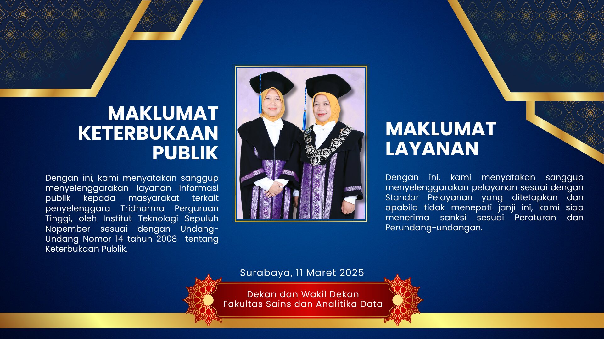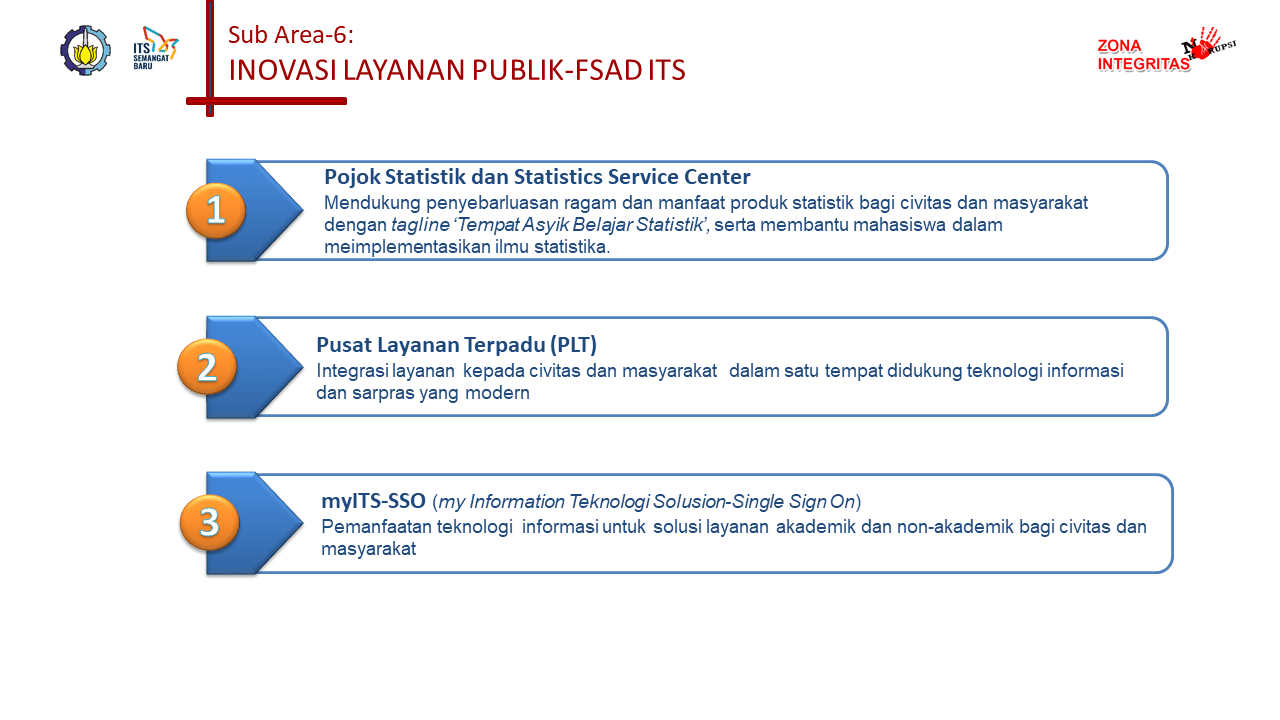 Sebagai bagian dari upaya mewujudkan tata kelola pemerintahan yang bersih, efektif, dan melayani, Fakultas Sains dan Analitika Data (FSAD) di bawah naungan Institut Teknologi Sepuluh Nopember (ITS) secara konsisten membangun Zona Integritas (ZI) menuju predikat Wilayah Bebas dari Korupsi (WBK) dan Wilayah Birokrasi Bersih dan Melayani (WBBM). Salah satu fokus utama dalam pembangunan ZI adalah Peningkatan Kualitas Pelayanan Publik yang menjadi wajah utama dari pelayanan institusi kepada masyarakat.