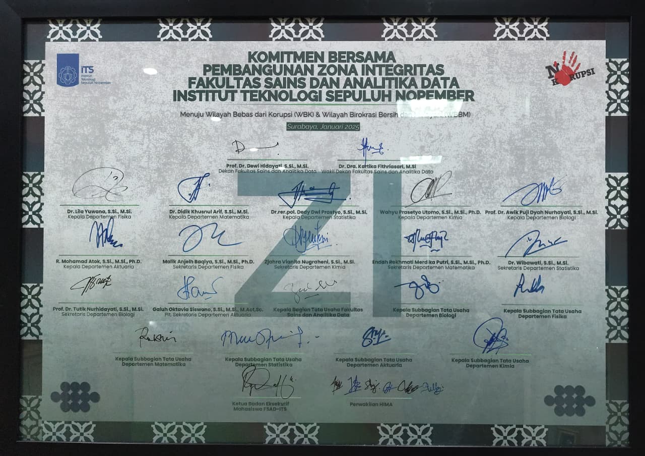 Dalam komitmennya untuk mewujudkan pemerintahan yang bersih dan akuntabel, Fakultas Sains dan Analitika Data (FSAD) Institut Teknologi Sepuluh Nopember (ITS) terus memperkuat pelaksanaan Zona Integritas (ZI) menuju predikat Wilayah Bebas dari Korupsi (WBK) dan Wilayah Birokrasi Bersih dan Melayani (WBBM). Salah satu komponen utama dalam pembangunan ZI adalah Penguatan Pengawasan, yang menjadi pilar penting dalam mencegah penyalahgunaan wewenang, meningkatkan kepatuhan, serta menumbuhkan budaya kerja yang jujur dan terbuka.