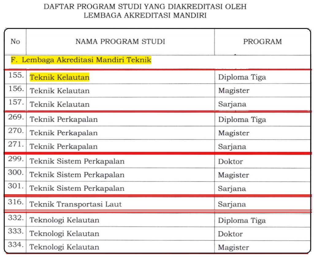 Selengkapnya, Program Studi yang Diakreditasi oleh Lembaga Akreditasi Mandiri ini telah ditetapkan dalam Keputusan Menteri Pendidikan, Kebudayaan, Riset, dan Teknologi Nomor 186/M/2021 tentang Program Studi yang Diakreditasi oleh Lembaga Akreditasi Mandiri pada tanggal 15 Juli 2021. Sementara itu beberapa program studi yang ada di bawah Fakultas Teknologi Kelautan (FTK), Institut Teknologi Sepuluh Nopember (ITS) yang ada dalam list KepMen tersebut adalah seperti dirangkum dalam tabel di bawah ini [@eRWePe, wadek FTK].