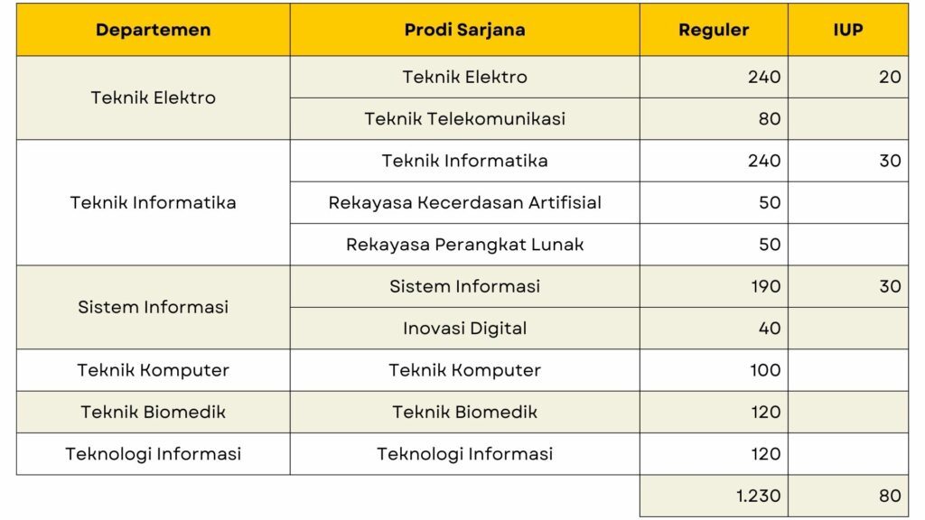 Berikut adalah rincian jumlah mahasiswa baru FT-EIC setiap Program Studi pada masing masing Departemen: