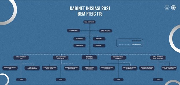 Adapun organigram Kabinet Inisiasi BEM FTEIC ITS 2021 dipimpin oleh Indra Widnyana dari Departemen Teknologi Informasi selaku Ketua BEM FTEIC ITS, yang dibantu oleh dua Sekretaris Jendral (Sekjend) yakni Bagus Pamungkas selaku Sekjend Eksternal dan Samara Fahira yang menjabat sebagai Sekjend Internal. Kedua mahasiswa ini berasal dari Departemen Teknik Elektro. Adapun Adeela Nurul selaku Sekretaris I dan Putri Aliya selaku Bendahara I yang masing-masing akan dibantu oleh Sekretaris II dan Bendahara II.