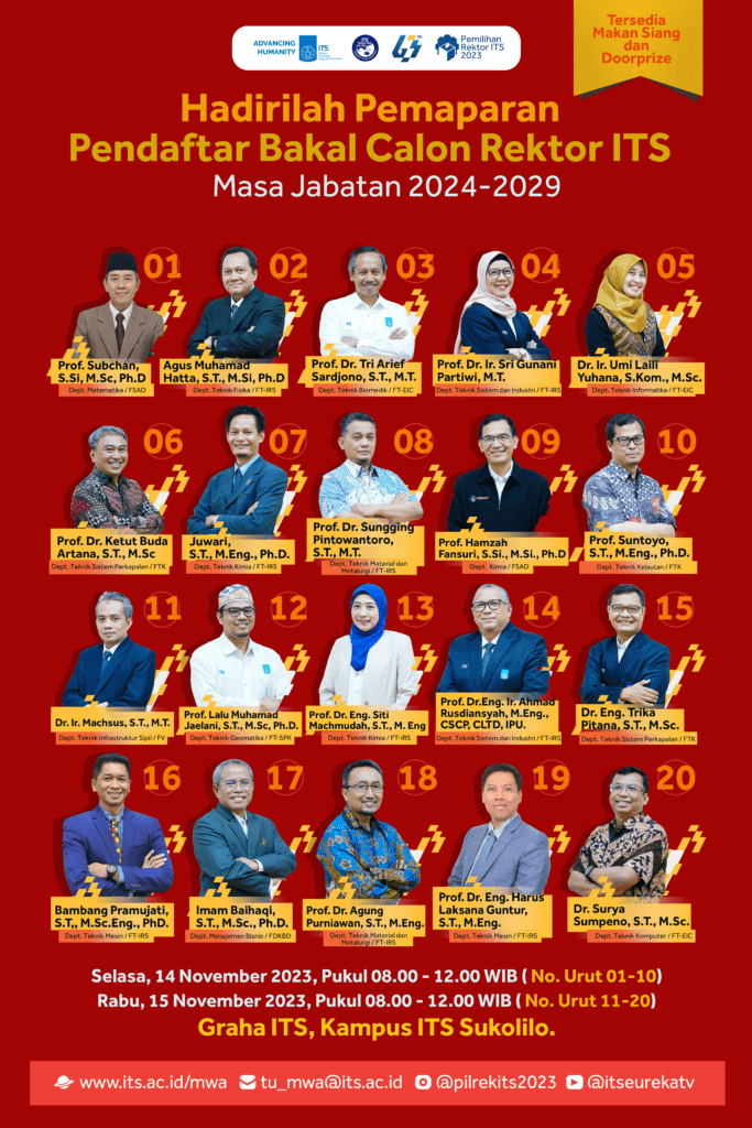 Masa Regenerasi Kepemimpinan Jabatan Rektor yang dilakukan setiap 5 tahun akan berakhir pada tahun 2024. Rangkaian Persiapan dan Tahapan dalam proses pemilihan rektor, sesuai dengan yang dipaparkan pada sosialisasi pemilihan rektor 17 Oktober lalu. Hingga pada tanggal 24 Oktober 2023, nomor pemilihan telah ditetapkan secara resmi untuk 20 bakal calon rektor (bacarek). Para bacarek merupakan dosen yang berprestasi dengan kontribusi serta capaian yang luar biasa di bidang masing-masing. Tiga dari 20 bacarek berasal dari Fakultas Teknologi Elektro dan Informatika Cerdas.