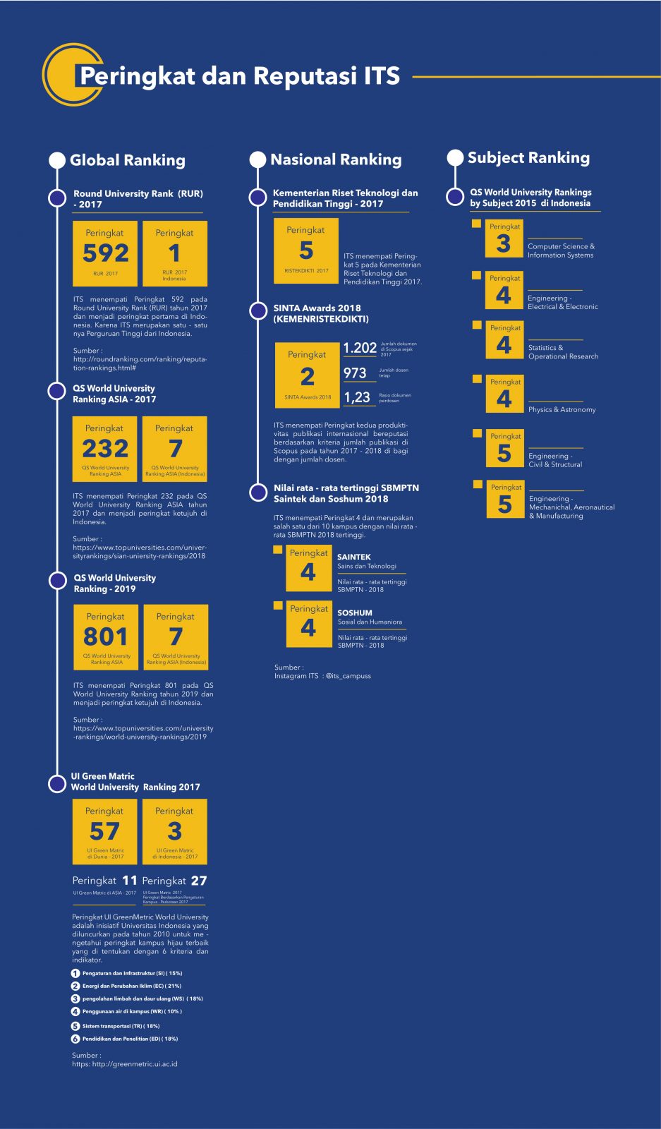 Sebagai salah satu perguruan tinggi berbasis sains dan teknologi tertua di Indonesia, ITS memiliki reputasi yang baik baik di tingkat nasional maupun internasional. Berikut ini adalah posisi ITS dalam berbagai hasil survei dari lembaga pemeringkatan.