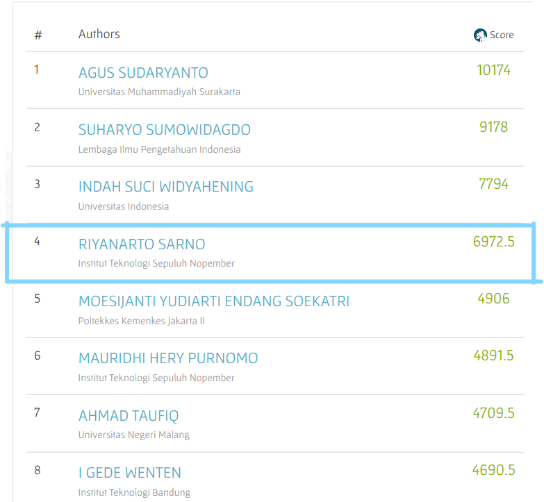 Sistem pemeringkatan di SINTA menggunakan capaian publikasi konferensi dan jurnal termasuk bagaimana kualitas jurnalnya sesuai kriteria pengindex publikasi internasional Scopus. Pengindex publikasi SINTA yang lain adalah Google Scholar.Diumumkan dalam video konferensi Bulan Mei lalu, dari 198.494 dosen dan peneliti lain yang telah terdaftar dalam SINTA, Kemenristek/BRIN menetapkan Prof Riyanarto Sarno sebagai peraih posisi keempat peneliti terbaik tingkat nasional.Pasalnya, Dosen Departemen Informatika yang akrab disapa Riyan ini telah melakukan 75 publikasi jurnal internasional terindex scopus dan 173 publikasi Conference internasional yang juga telah terindex scopus.Berkat produktivitas dan inovasi tanpa henti tersebut, pria yang pada tahun lalu menyabet peringkat pertama publikasi ilmiah kategori penulis SINTA Awards 2019 ini berhasil mendapat akumulasi nilai 6893. Bahkan dalam pemeringkatan Scopus, Guru Besar Informatika tersebut sukses bertengger di peringkat satu se-Indonesia.