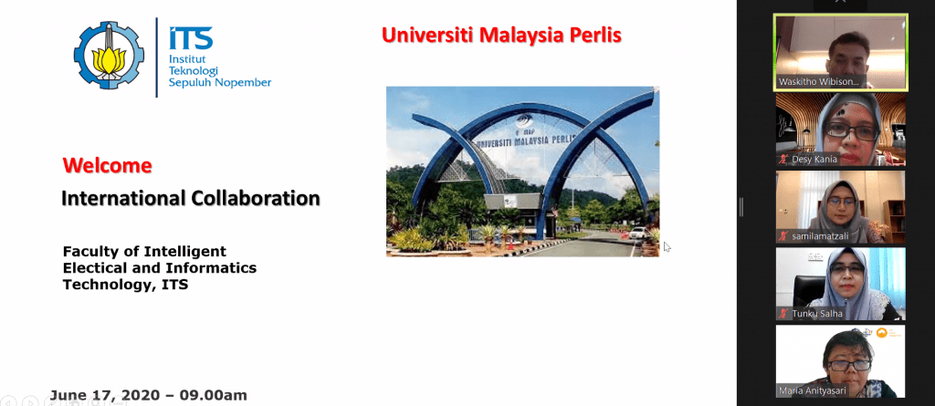 Selaras dengan visinya menuju institut berkelas dunia, ITS melalui International Office (IO) selalu aktif menjalin kerjasama dengan berbagai universitas mancanegara. Salah satunya ialah hubungan kerjasama antara ITS dengan Departemen Teknik Elektro UniMAP.Untuk melakukan pembahasan yang lebih mendalam mengenai tersebut diadakanlah rapat koordinasi melalui media daring Zoom Meeting. Pertemuan yang dimulai pada pukul Sembilan pagi ini menghadirkan Dekan Fakultas Teknik Elektro UniMAP Dr Haziah Abdul Hamid dan Dr Tunku Salha Direktur International Affairs UniMAP.Rapat dibuka oleh Direktur Kemitraan Global ITS, Prof Maria Anityasari PhD dan kemudian dilanjutkan dengan pengenalan visi misi serta profil masing-masing perguruan tinggi. FTEIC juga melakukan pengenalan departemen dan program studi dalam fakultas yang dipaparkan langsung oleh Dekan FTEIC, Dr I Ketut Eddy Purnama ST MT.