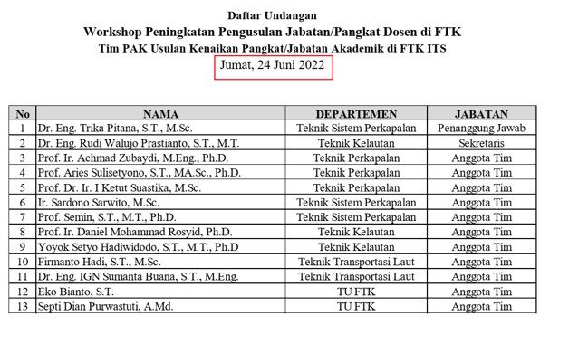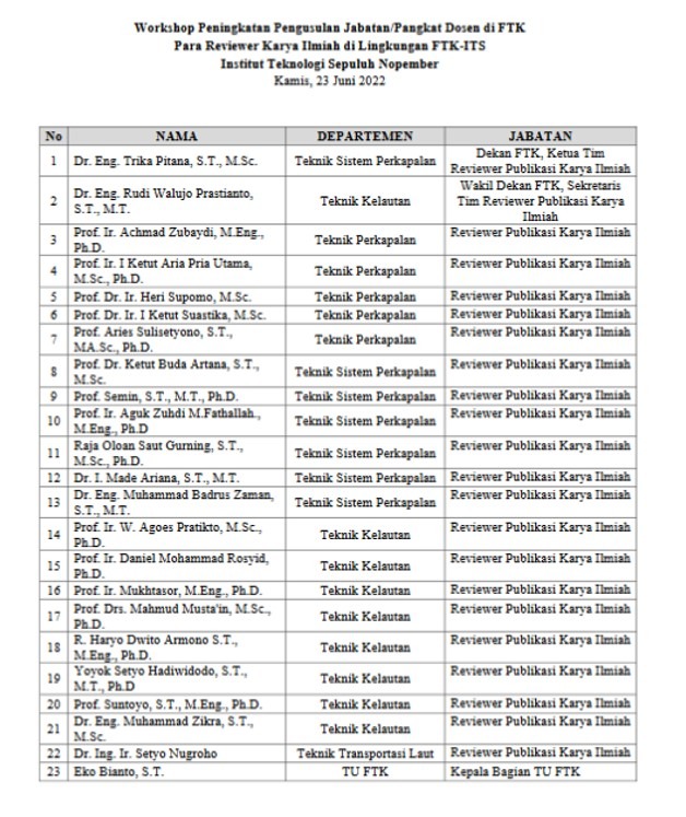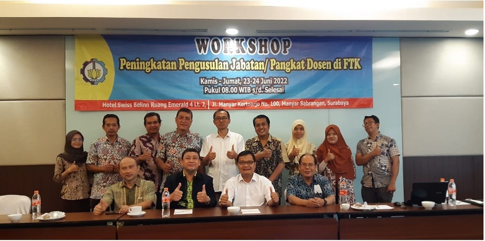 Pada bulan Juni 2022, unit FTK (Fakultas Teknologi Kelautan) ITS mengadakan Workshop dengan tema “Peningkatan Pengusulan Jabatan/Pangkat Dosen di FTK”. Acara Workshop ini diadakan di Hotel Swiss Belinn, Manyar Sabrangan Surabaya selama dua hari, Kamis (23 Juni 2022) dan Jum’at (24 Juni 2022).