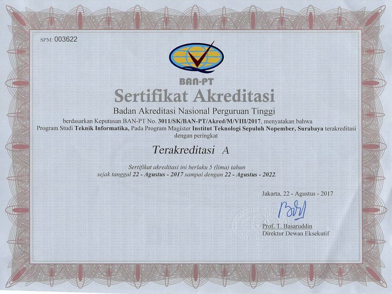 Program Studi Magister (S2) Departemen Teknik Informatika telah dinyatakan sebagai program studi dengan akreditasi unggul (akreditasi tertinggi) oleh LAM INFOKOM pada tahun 2022 sampai 2027.
