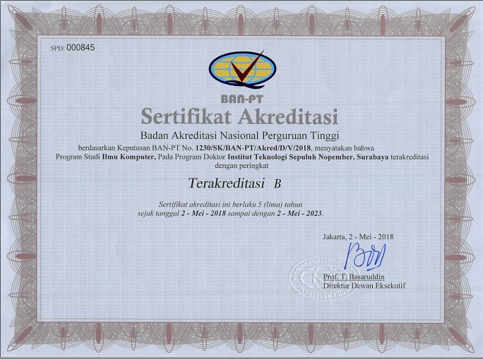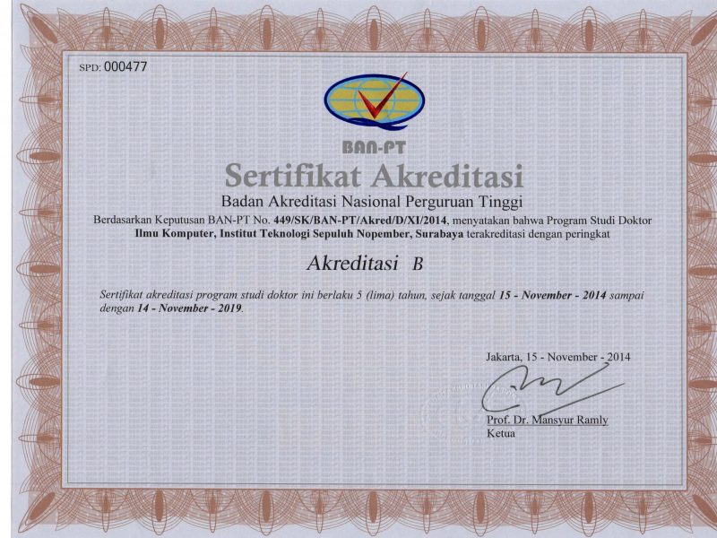 Program Studi Doktor (S3) Ilmu Komputer Departemen Teknik Informatika telah dinyatakan sebagai program studi dengan akreditasi unggul (akreditasi tertinggi) oleh LAM INFOKOM pada tahun 2023 sampai 2028.