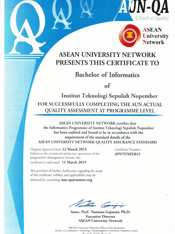 Departemen Teknik Informatika ITS memiliki reputasi di tingkat nasional dan internasional. Hal ini dibuktikan dengan akreditasi dan sertifikat yang menjamin kualitas pendidikan dan penelitian di Departemen Teknik Informatika. Temukan Informasi mengenai akreditasi dan sertifikat yang dimiliki Departemen Teknik Informatika disini,