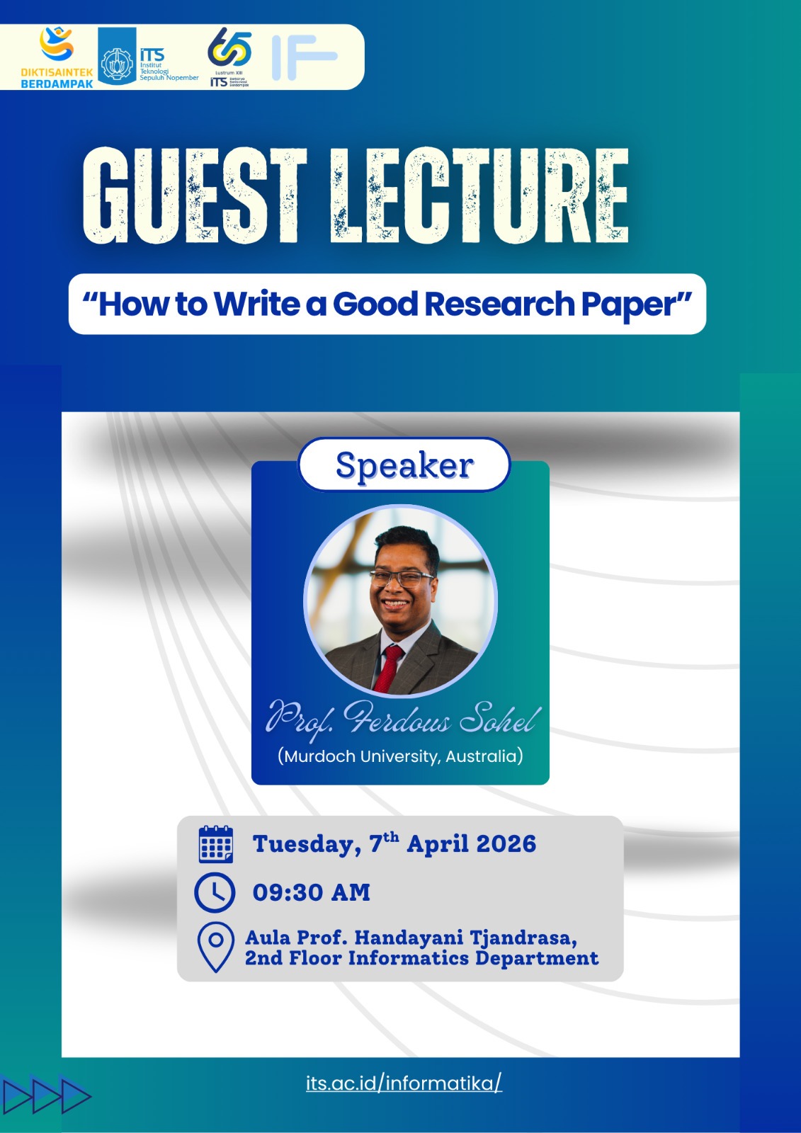Guest Lecture How to Write a Good Research Papper Speaker Prof. Ferdous Sohel Murdoch University, Australia Tuesday, 7 April 2026 09.30 Am Aula Prof. Handayani Tjandrasa 2nd Floor Informatics Department