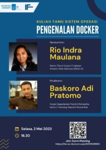 Departemen Teknik Informatika ITS menyelenggarakan kuliah tamu dengan tema “Pengenalan Docker” sebagai bagian dari matakuliah Sistem Operasi pada Selasa, 2 Mei 2023. Kuliah tamu ini mengundang Rio Indra Maulana yang merupakan Senior Cloud Support Engineer di Amazon Web Services, US sebagai narasumber dan dimoderatori dosen Departemen Teknik Informatika, Baskoro Adi Pratomo.
