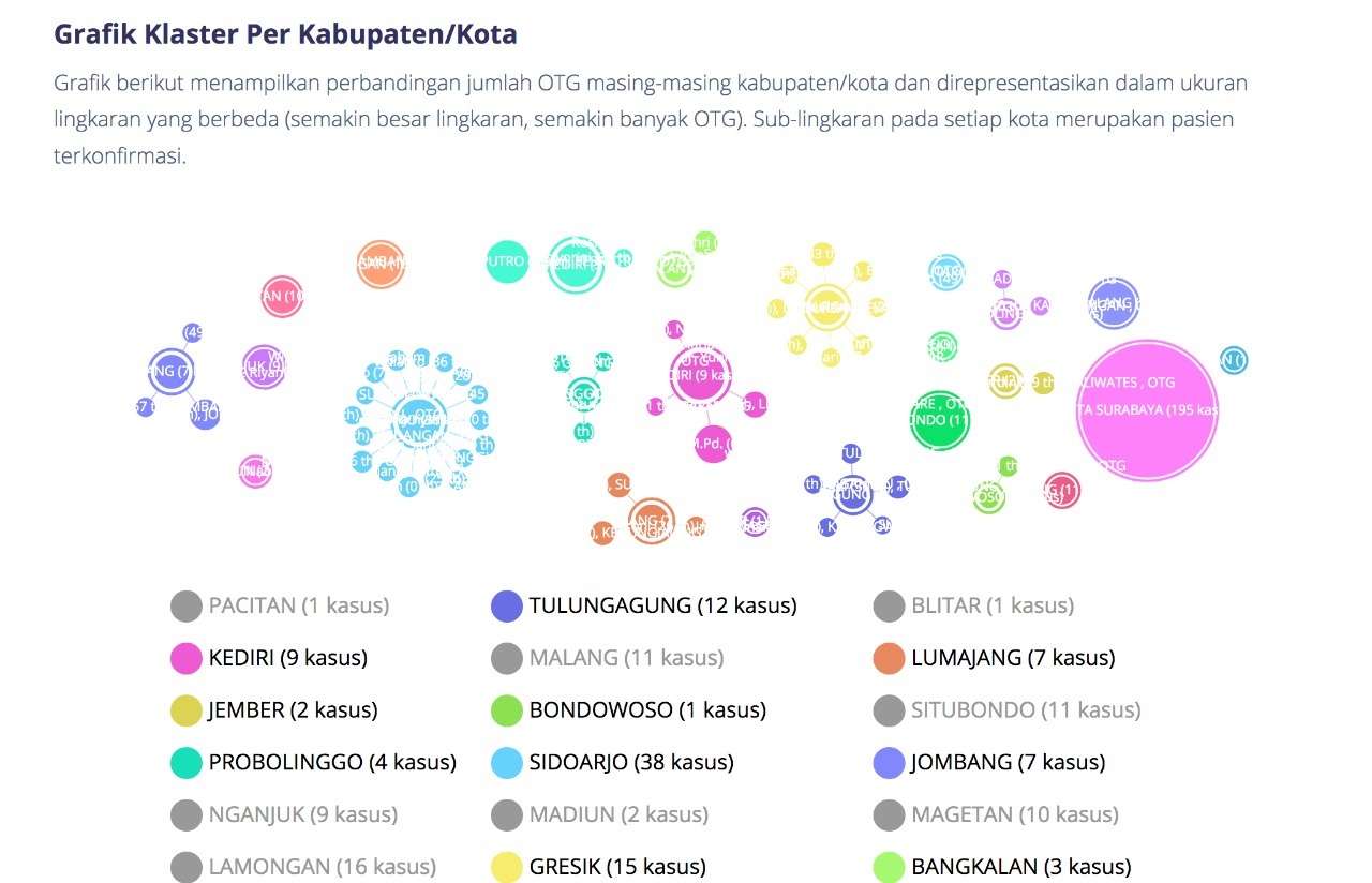 Graph of COVID-19 Clusters based on Regency/City (Kabupaten/Kota) displayed on the website tracingCovid19.jatimprov.go.id by the ITS Team