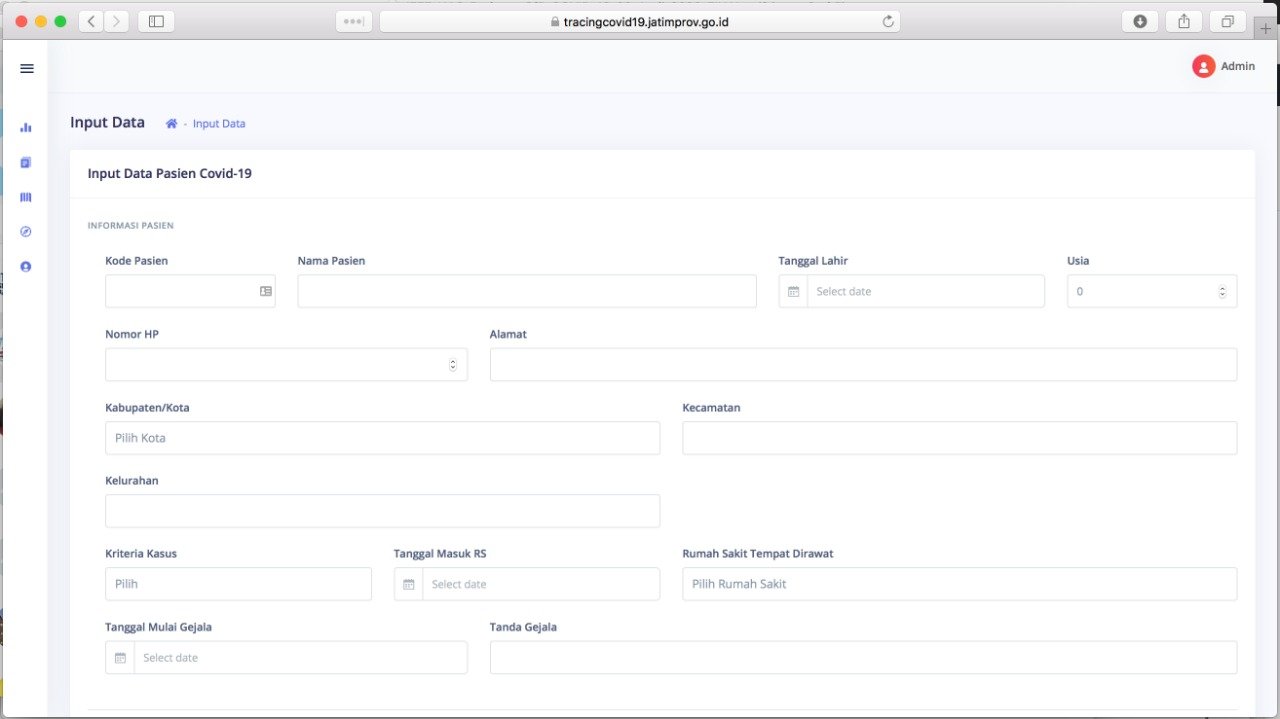 A screenshot of COVID-19 patient data input on the website tracingCovid19.jatimprov.go.id by the ITS Team