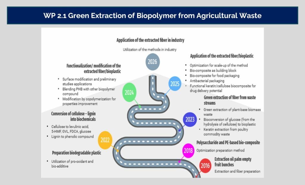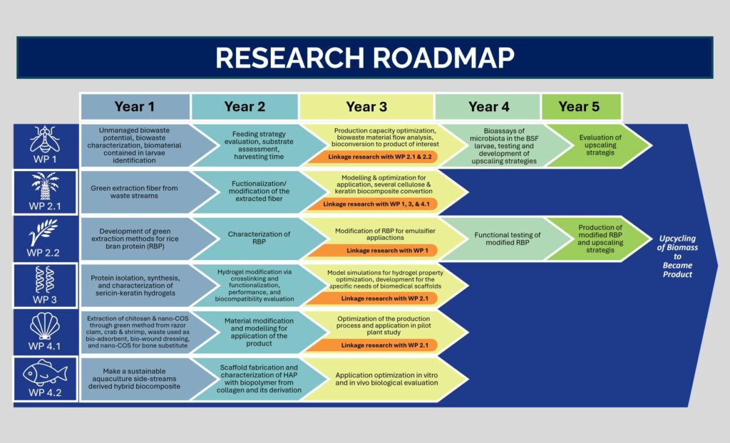 Biomass Valorization Towards Implementing a Circular Bioeconomy is an effort to process biomass waste into environmentally friendly, value-added products. This program supports a circular economy by utilizing waste as a resource for the food, health, and industrial sectors. Through this research, various types of waste, such as municipal waste, agricultural waste, animal waste, and seawater/aquaculture, will be developed into raw materials for food, pharmaceutical, health, and industrial products. This program also encourages waste reduction, increased regional income, and national resource resilience.