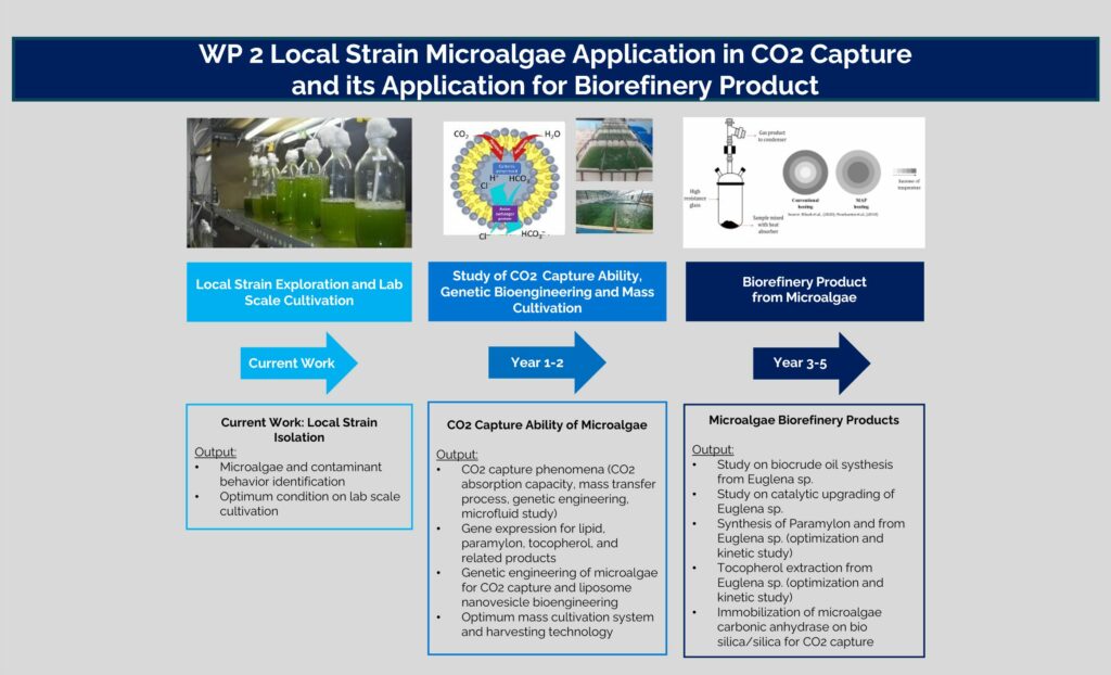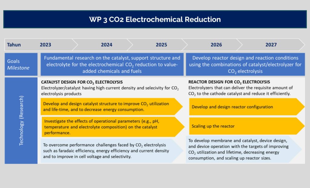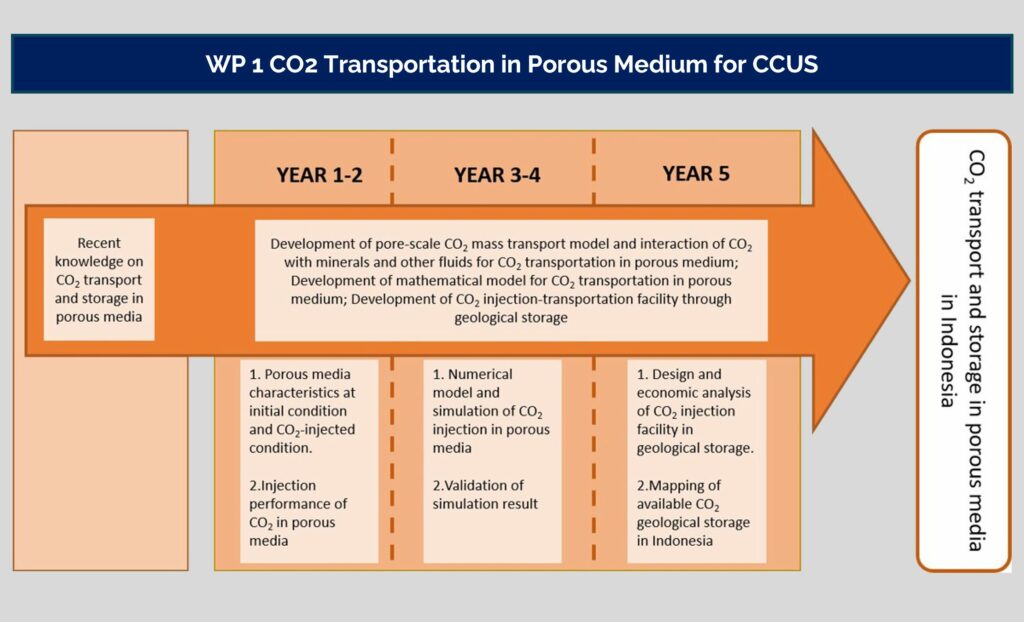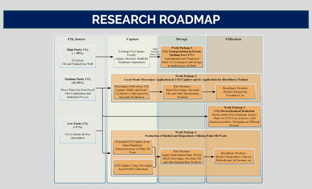 Carbon capture utilization and storage (CCUS) technology is the main solution for reducing carbon dioxide emissions from the industrial and power generation sectors. This research involves four joint work packages (WPs) carried out collaboratively by ITS, UGM, and NTU. In WP 1, the CCUS technology of CO2 sequestration performance in geologic storage is determined by studying the phenomenon of CO2 transport in porous media. In WP 2 and WP 4, the CCUS concept integrated with CO2 capture using microalgae and biomass is utilized to become biorefinery products. In WP 3), CO2 utilization is realized through electrochemical reduction. Through these four work packages (WP), the goal is to obtain a high-performance and economical carbon capture, utilization, and storage system to support net-zero emissions in Indonesia.