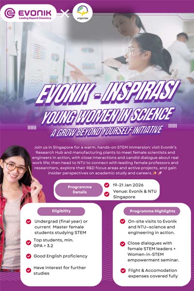 Kampus ITS, INSPIRASI News — In a powerful collaboration between Evonik and INSPIRASI, the program "Young Women in Science: A Grow Beyond Yourself Initiative" invites young women to explore the world of science alongside inspiring female researchers and innovators — a rare chance to experience growth beyond yourself through real-world STEM immersion.