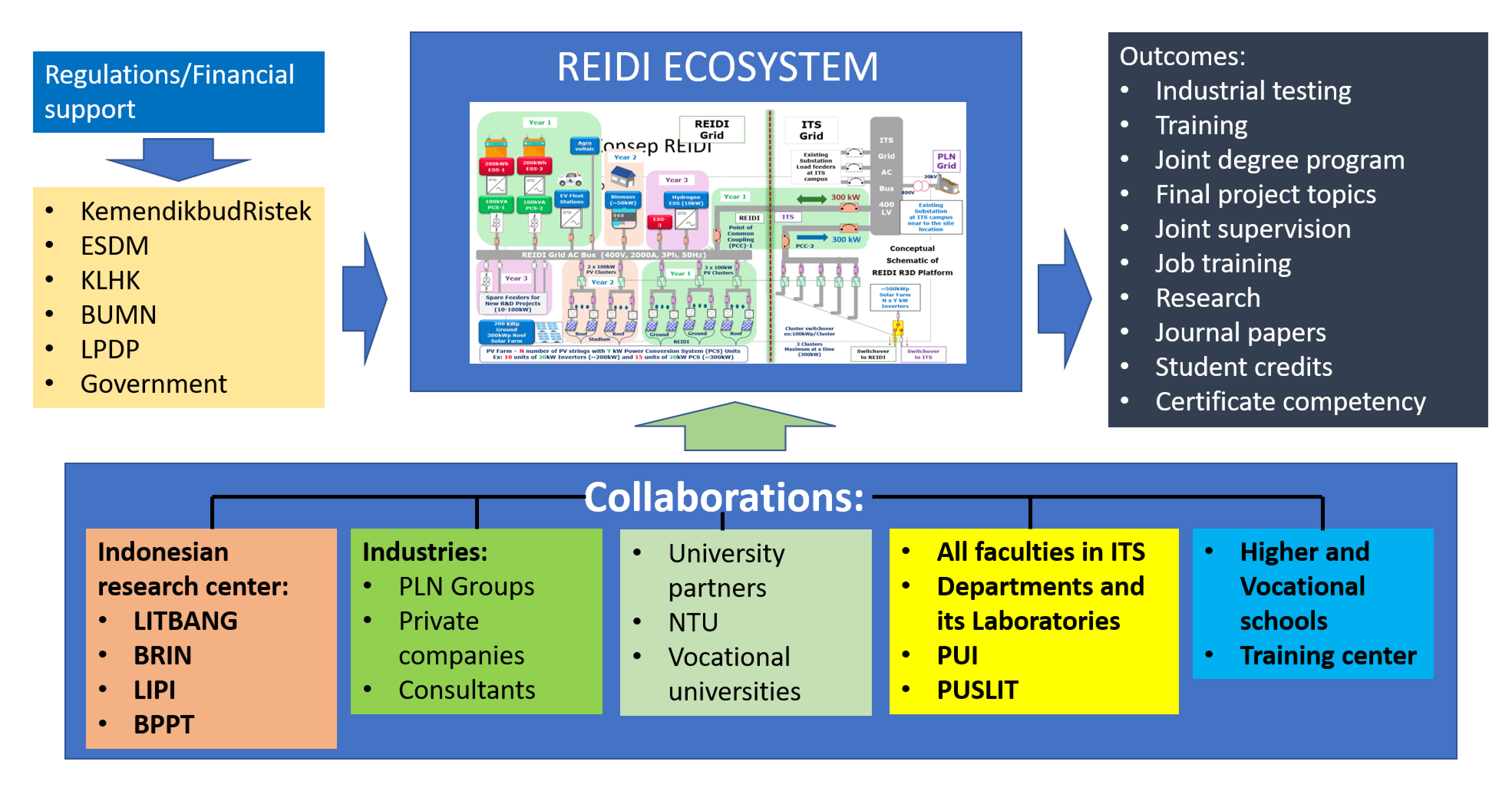 Renewable Energy Integration Demonstrator of Indonesia at ITS Surabaya (REIDI) is the largest research, demonstration, training and testing facility in Indonesia related to new renewable energy (EBT) systems.
