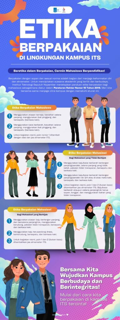 Berpakaian sopan dan sesuai norma merupakan bagian penting dalam menjaga kehormatan diri dan almamater di Institut Teknologi Sepuluh Nopember (ITS). Sebagai institusi pendidikan terkemuka, ITS berkomitmen untuk menciptakan suasana akademik yang tertib dan berbudaya. Untuk itu, ITS menetapkan panduan etika berpakaian bagi mahasiswa yang tercantum dalam Peraturan Rektor Nomor 15 Tahun 2019.