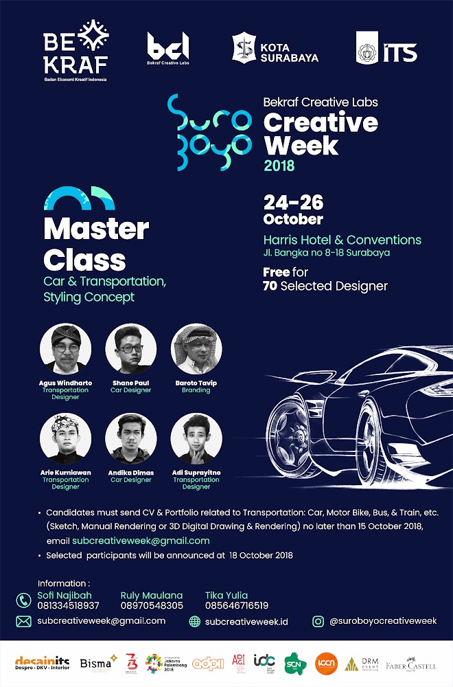 Master Class Car & Transportation Styling untuk profesional dan mahasiswa desain industri, desain komunikasi visual & industri transportasi. Workshop akan mengeksplorasi konsep, gambar desain kreatif, teknik rendering untuk presentasi. Presentasi konsep desain akan ditampilkan dalam Pameran SCW 2018.