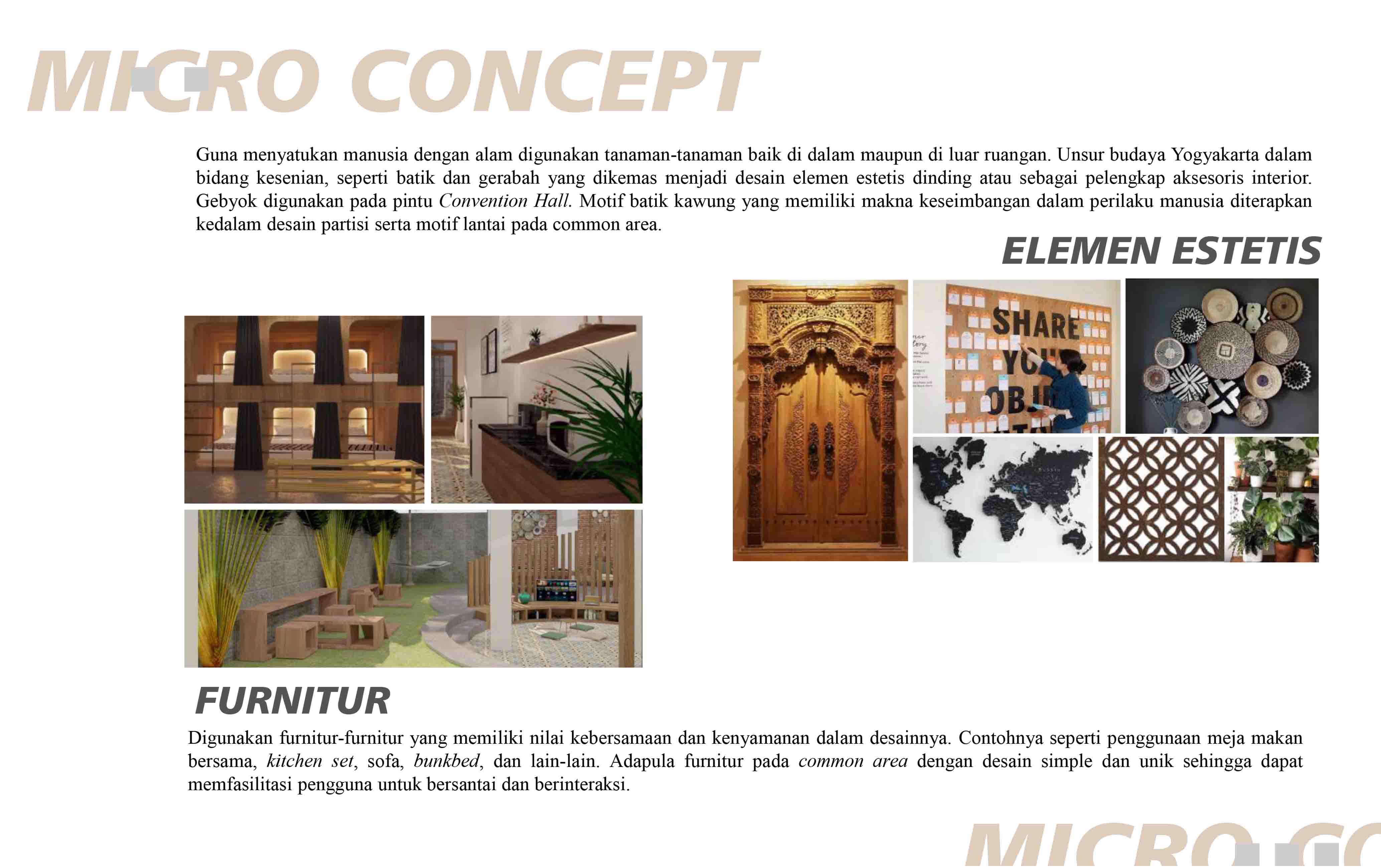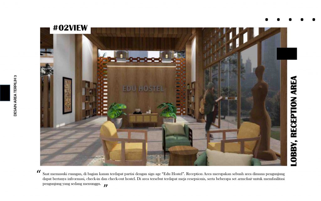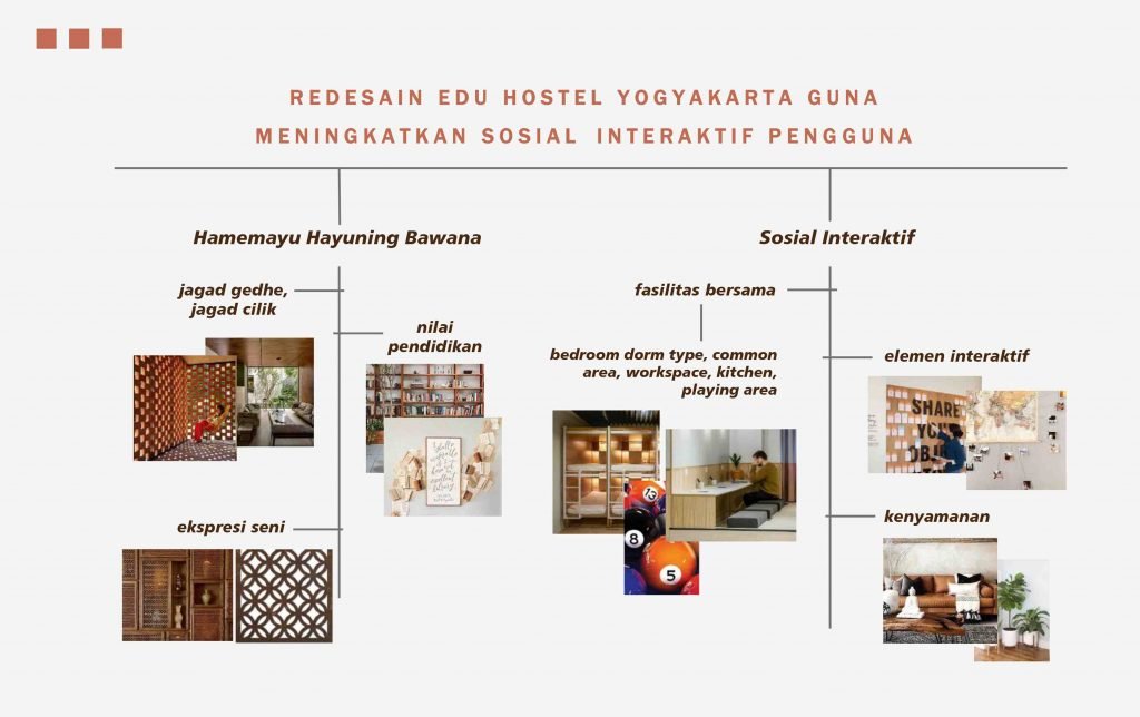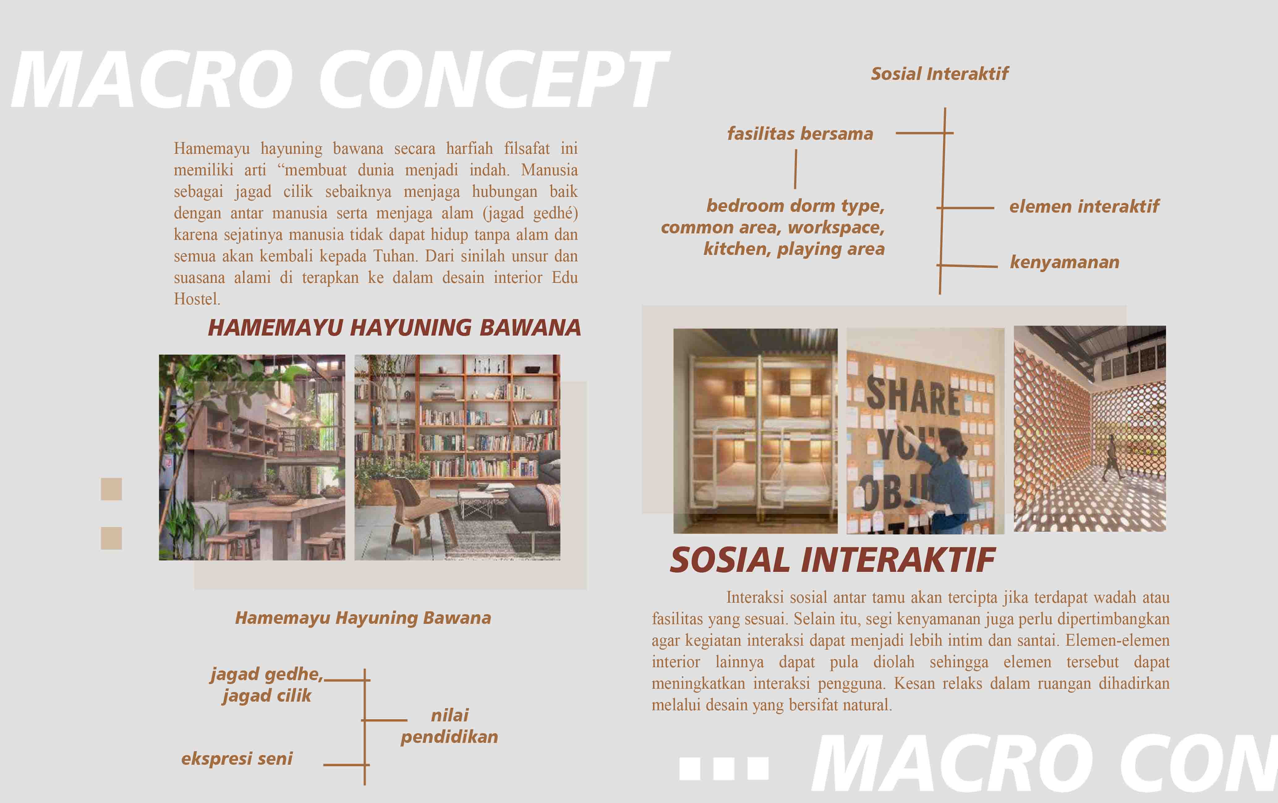 Edu Hostel merupakan sebuah hostel di Yogyakarta yang memiliki visi misi edukasi, terutama mengenai Kota Yogyakarta. Maka selain penanaman konsep interaksi sosial, diterapkan pula konsep edukasi mengenai tata nilai budaya Yogyakarta yang Dituangkan kedalam desain interior. Tata nilai budaya yang diterapkan dapat berupa nilai Filosofis ataupun dalam hal kesenian khas Yogyakarta yang kemudian diolah dan Diterapkan kedalam penataan layout serta pembangunan suasana dan nilai esetika ruang.